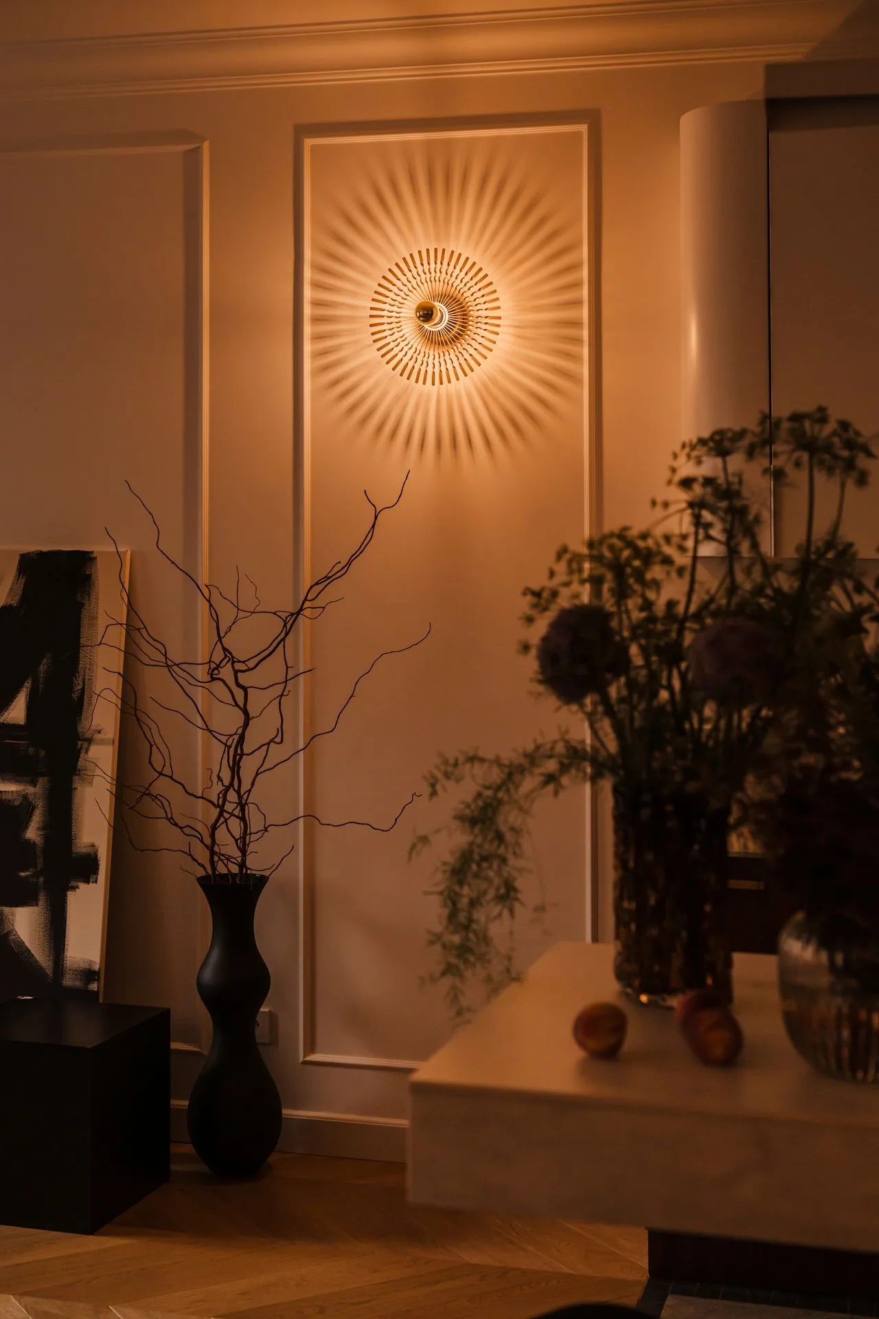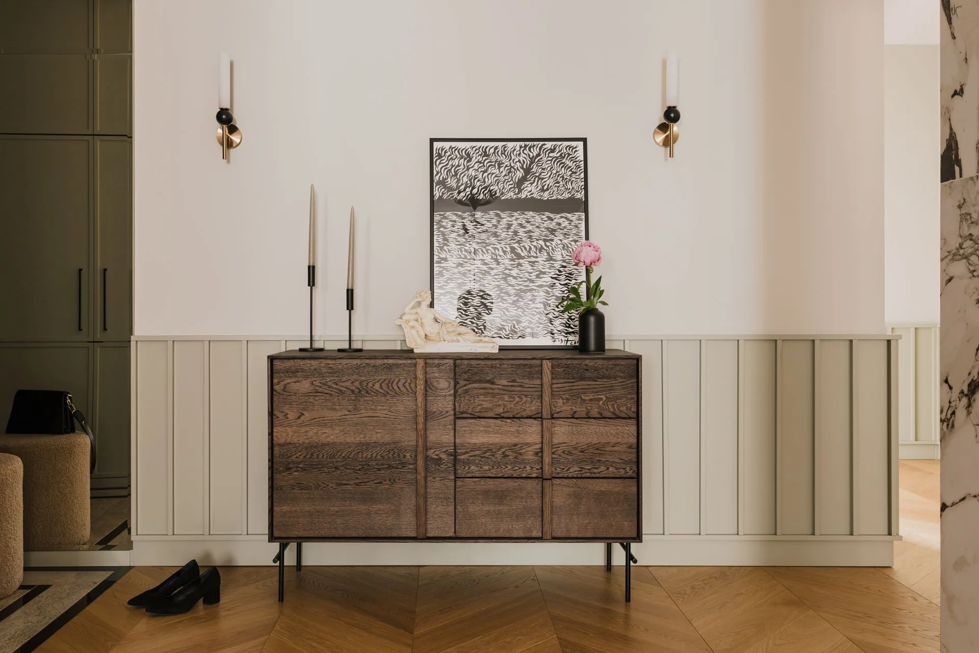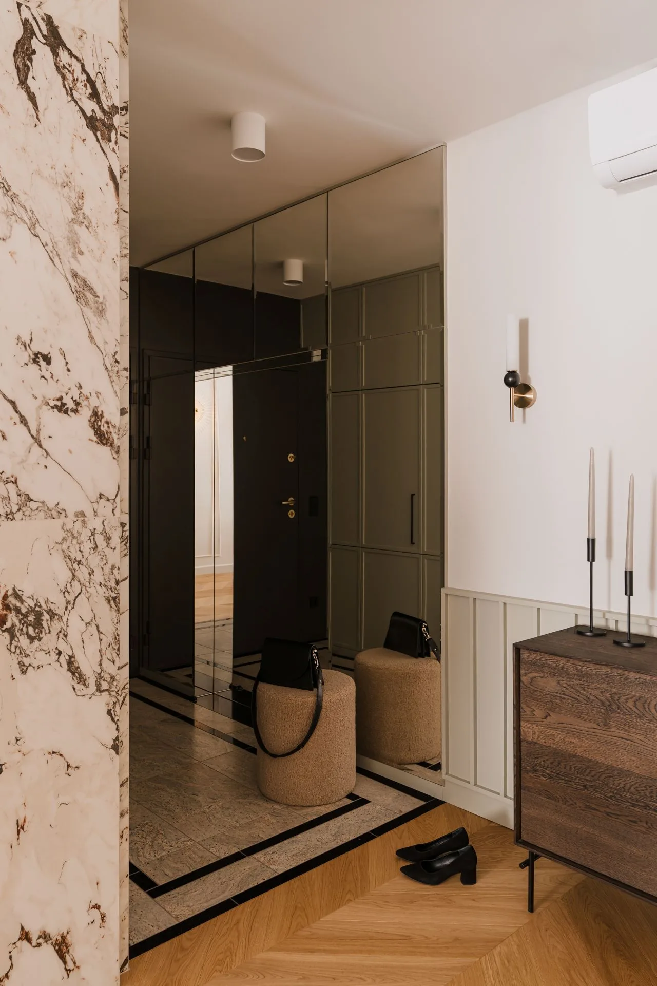Już od progu gości wita gra świateł i odbić. Wielopłaszczyznowe lustro z subtelnym fazowaniem nie tylko powiększa optycznie przestrzeń, ale staje się dyskretnym dziełem sztuki. W duecie ze sztukaterią i kamienną posadzką tworzy zaproszenie do świata, gdzie każdy detal jest świadomym wyborem.