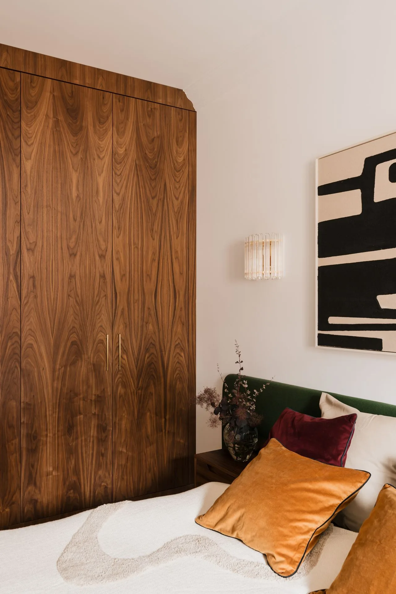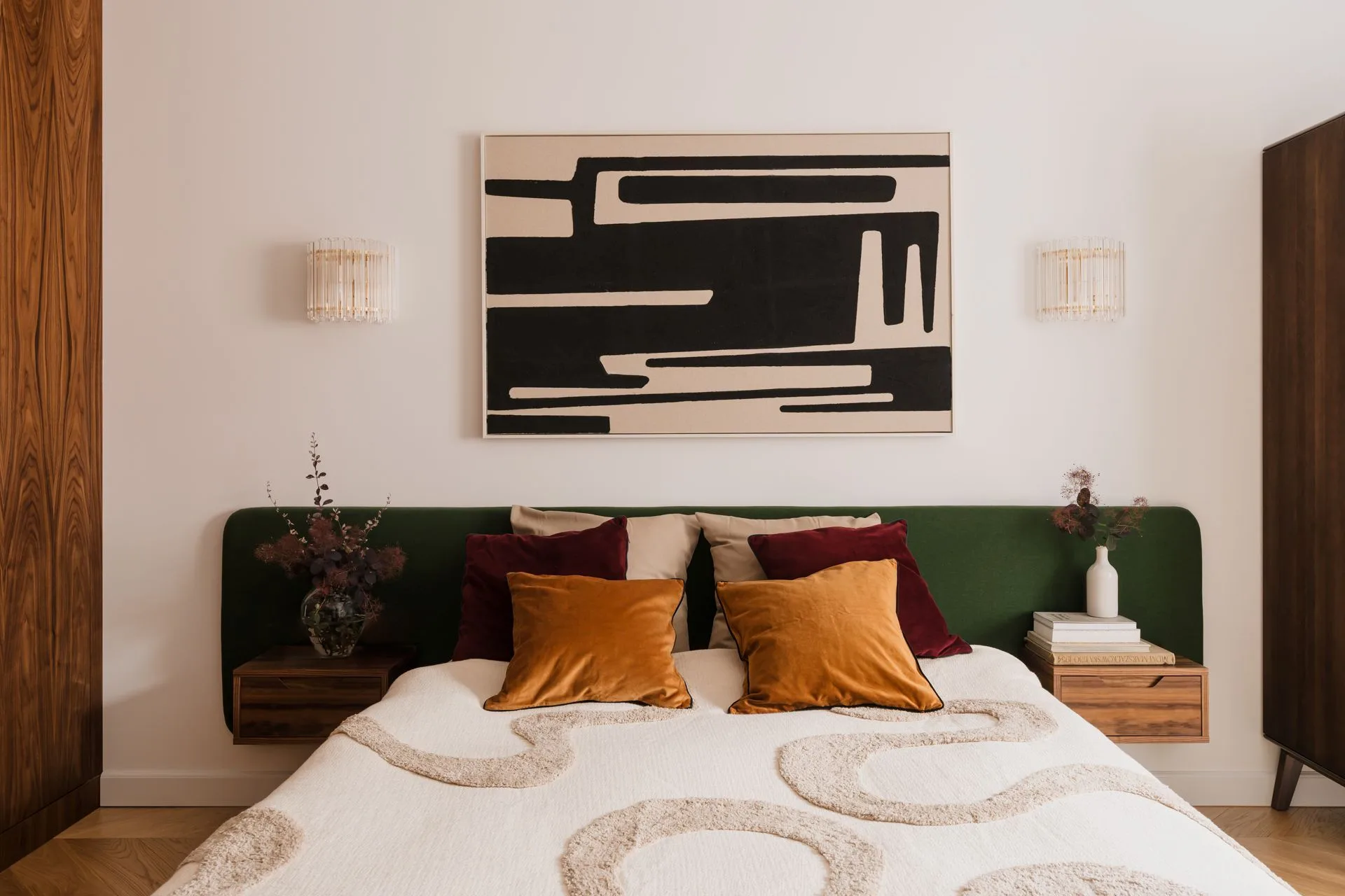 W strefie nocnej główną rolę odgrywa łóżko w zielonej tapicerce. Obok niego – fornirowana szafa. Nad łóżkiem zawisł geometryczny, czarno-biały obraz – nowoczesny akcent, podkreślający, że klasyka nie boi się flirtu z awangardą.