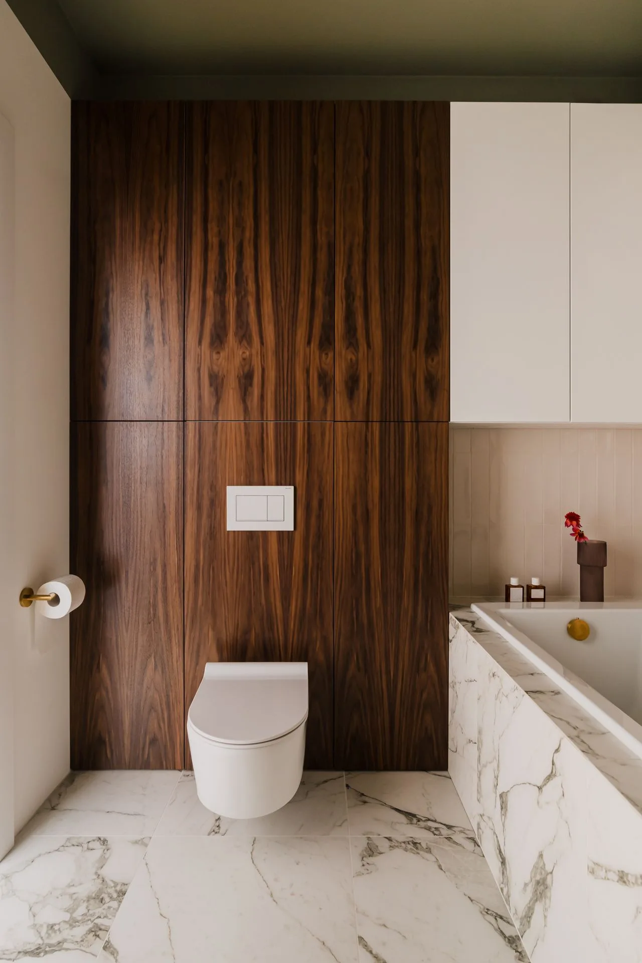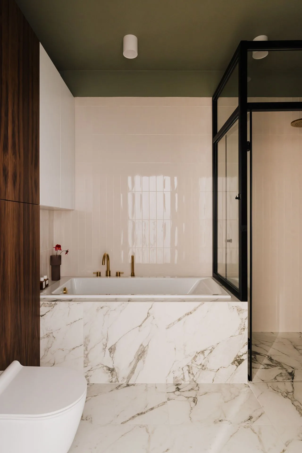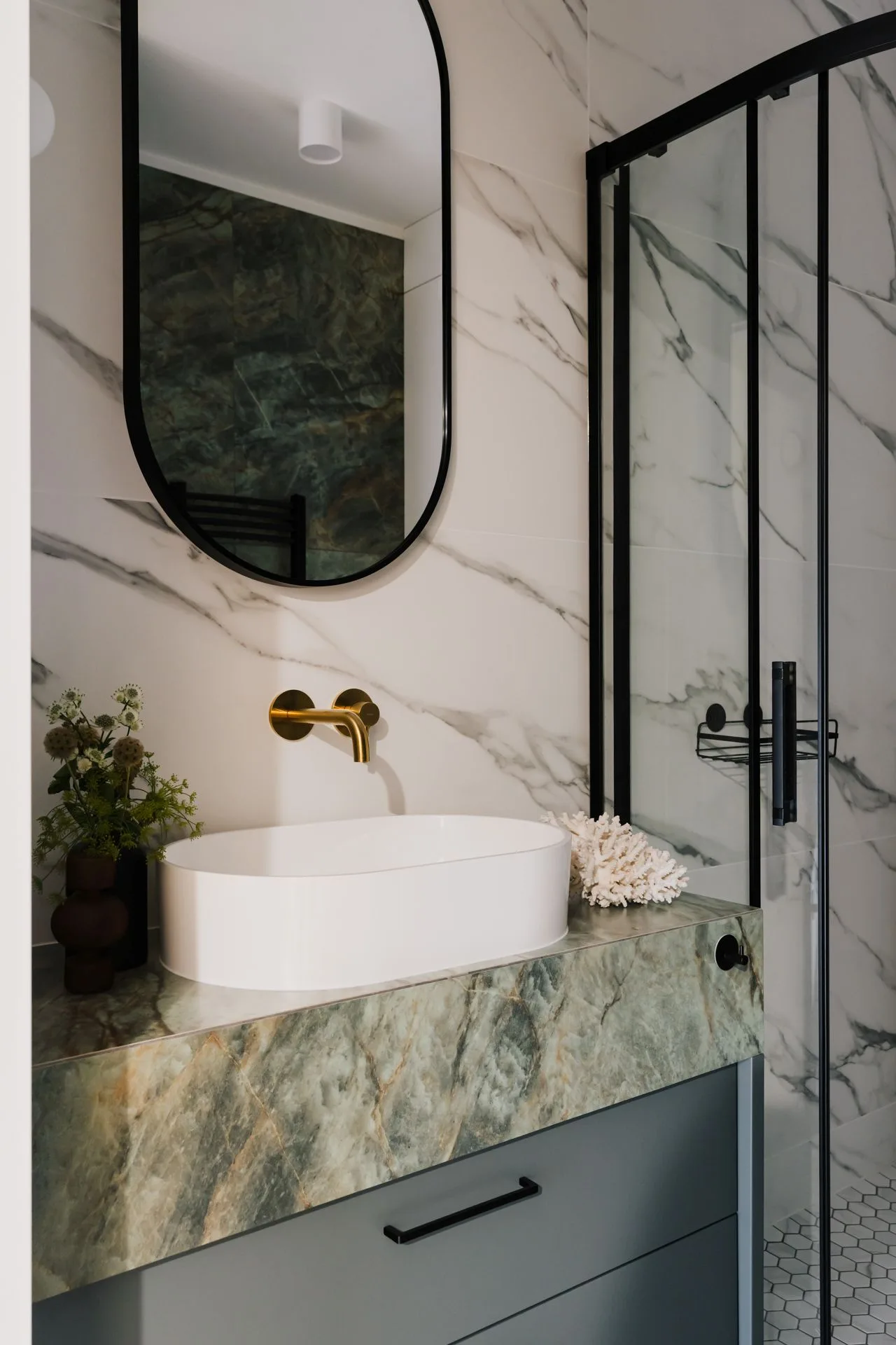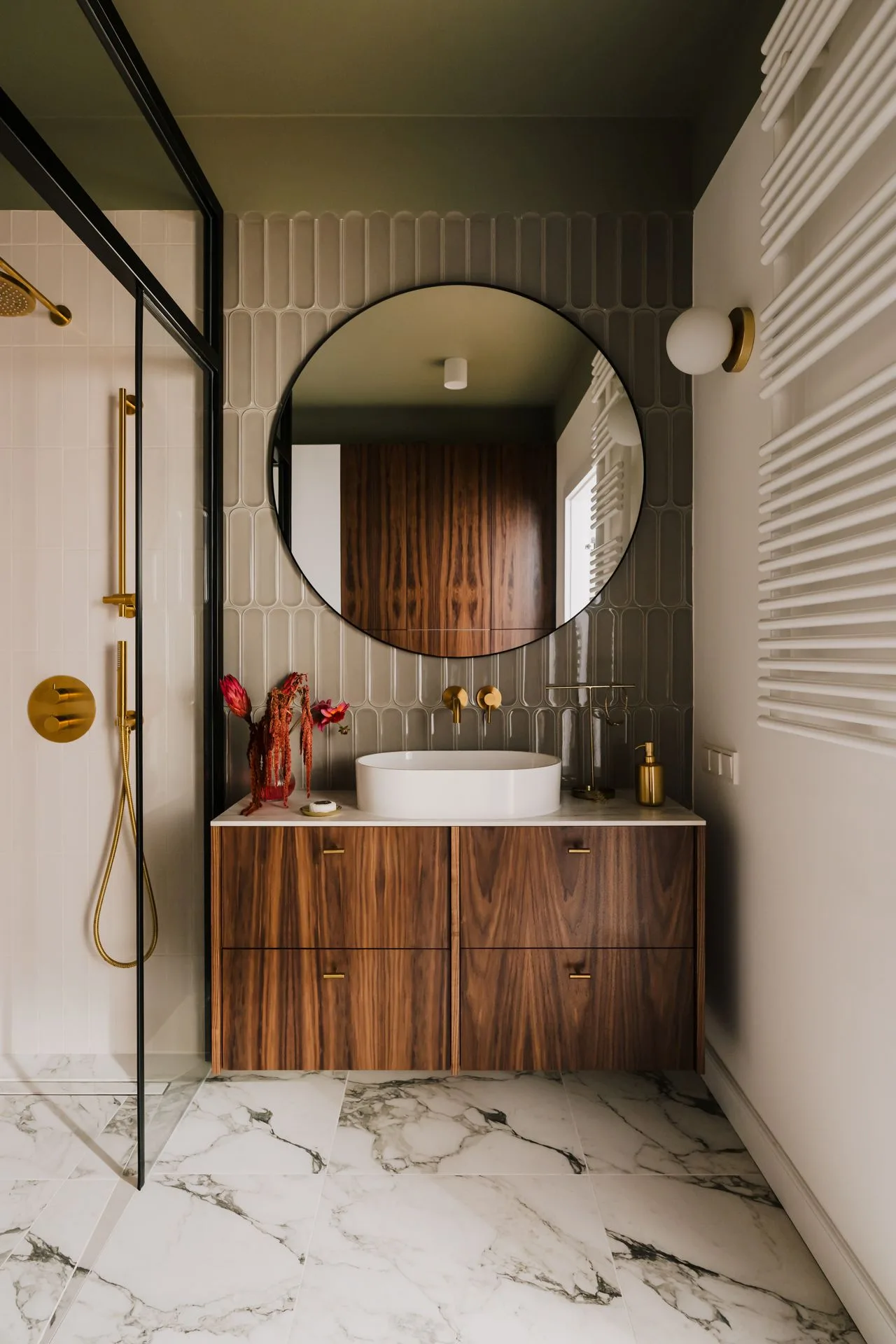 Łazienki to osobne rozdziały tej opowieści o designie. W master bathroom dominuje subtelna zieleń – płytki o trójwymiarowej strukturze zestawiono z meblami w ciemnym fornirze, a sufit w tym samym odcieniu dopełnia kompozycję. W łazience ogólnej króluje płytka imitująca zielony marmur i mozaikowa posadzka – elegancja spotykająca się z dynamiką wzoru.