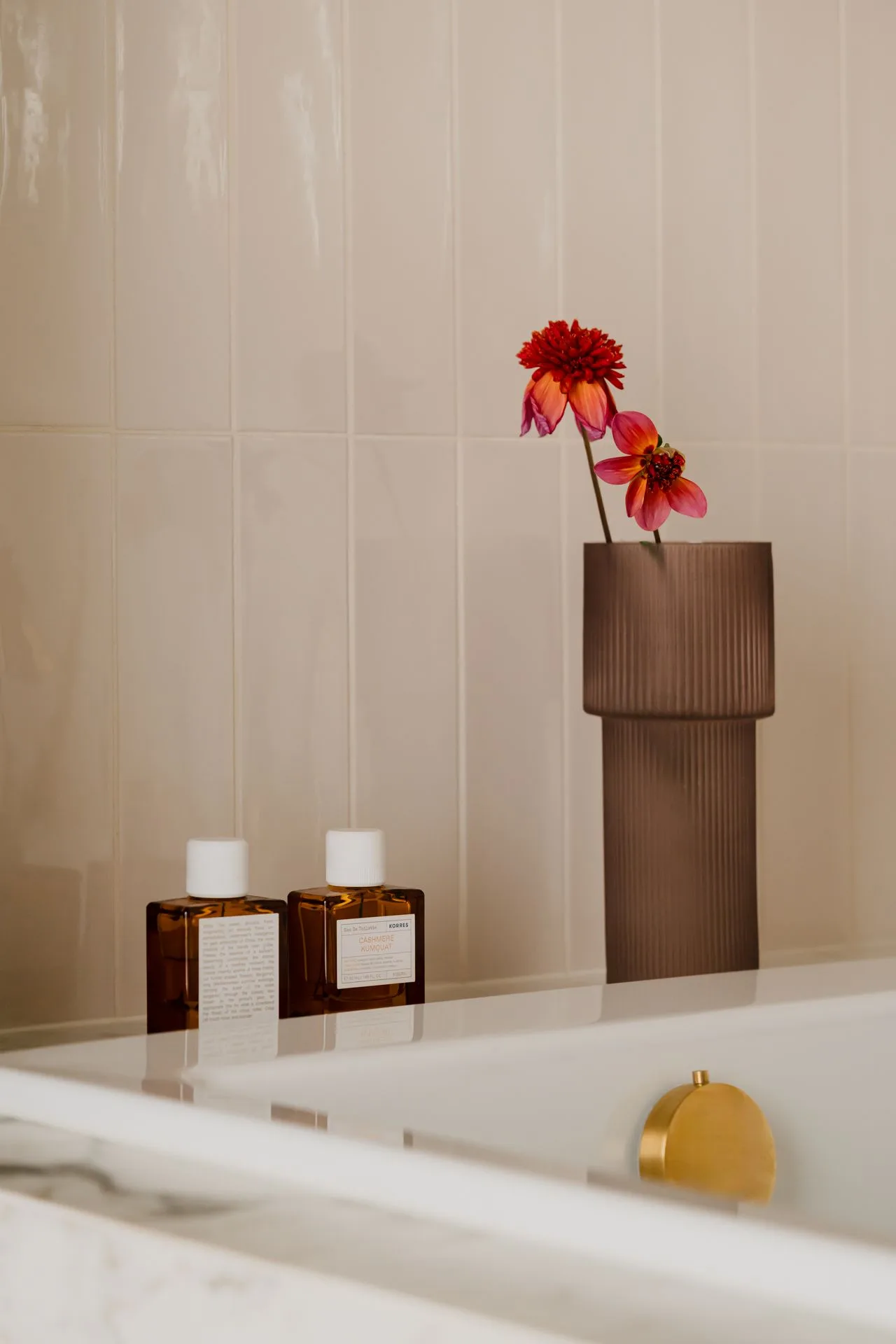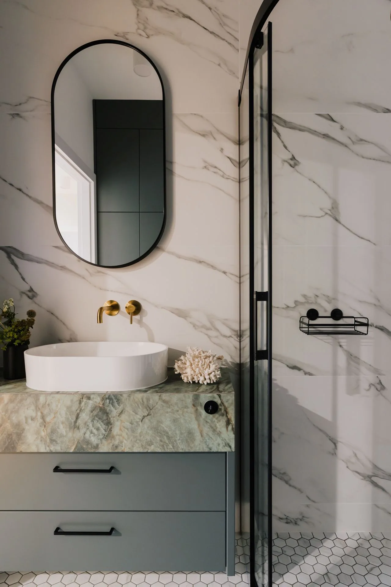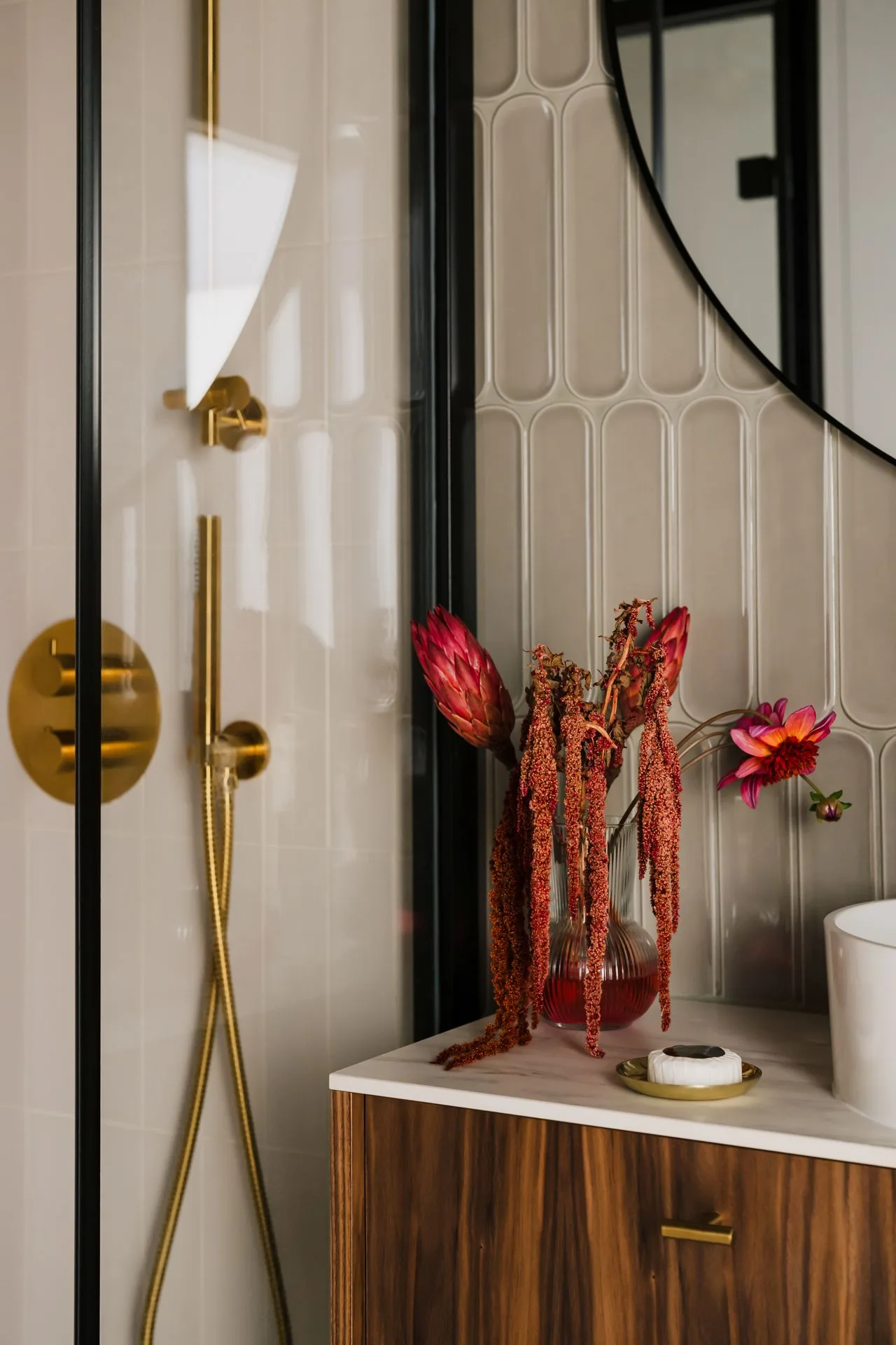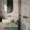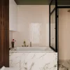 Łazienki to osobne rozdziały tej opowieści o designie. W master bathroom dominuje subtelna zieleń – płytki o trójwymiarowej strukturze zestawiono z meblami w ciemnym fornirze, a sufit w tym samym odcieniu dopełnia kompozycję. W łazience ogólnej króluje płytka imitująca zielony marmur i mozaikowa posadzka – elegancja spotykająca się z dynamiką wzoru.