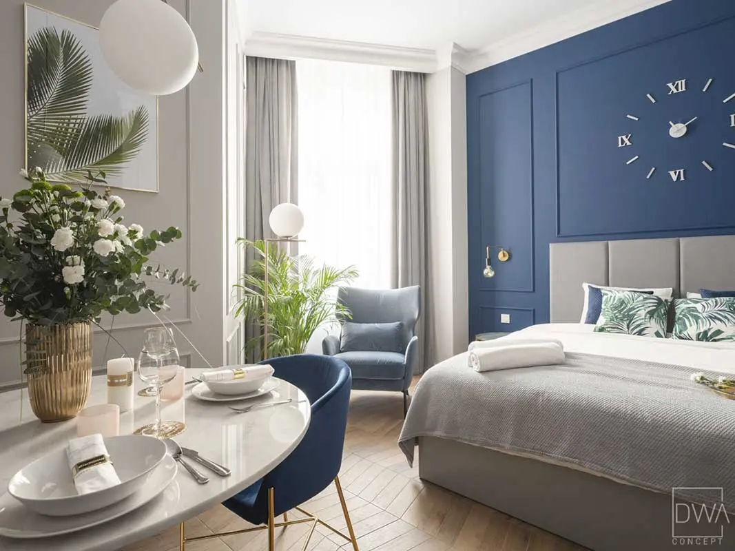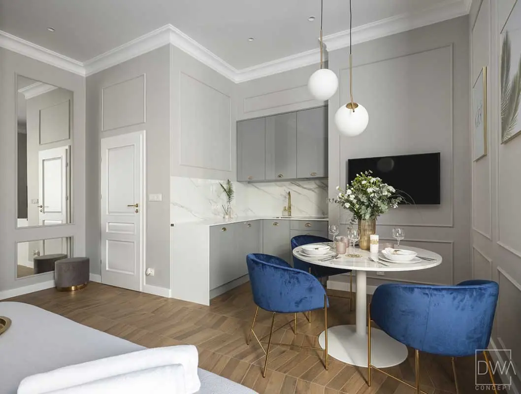 Pomimo niewielkiego metrażu, aranżacja ma odrobinę wspólnego z luksusowymi apartamentami. Materiały, takie jak złoto, marmur czy welur doskonale podkreślają elegancki charakter wnętrza.
