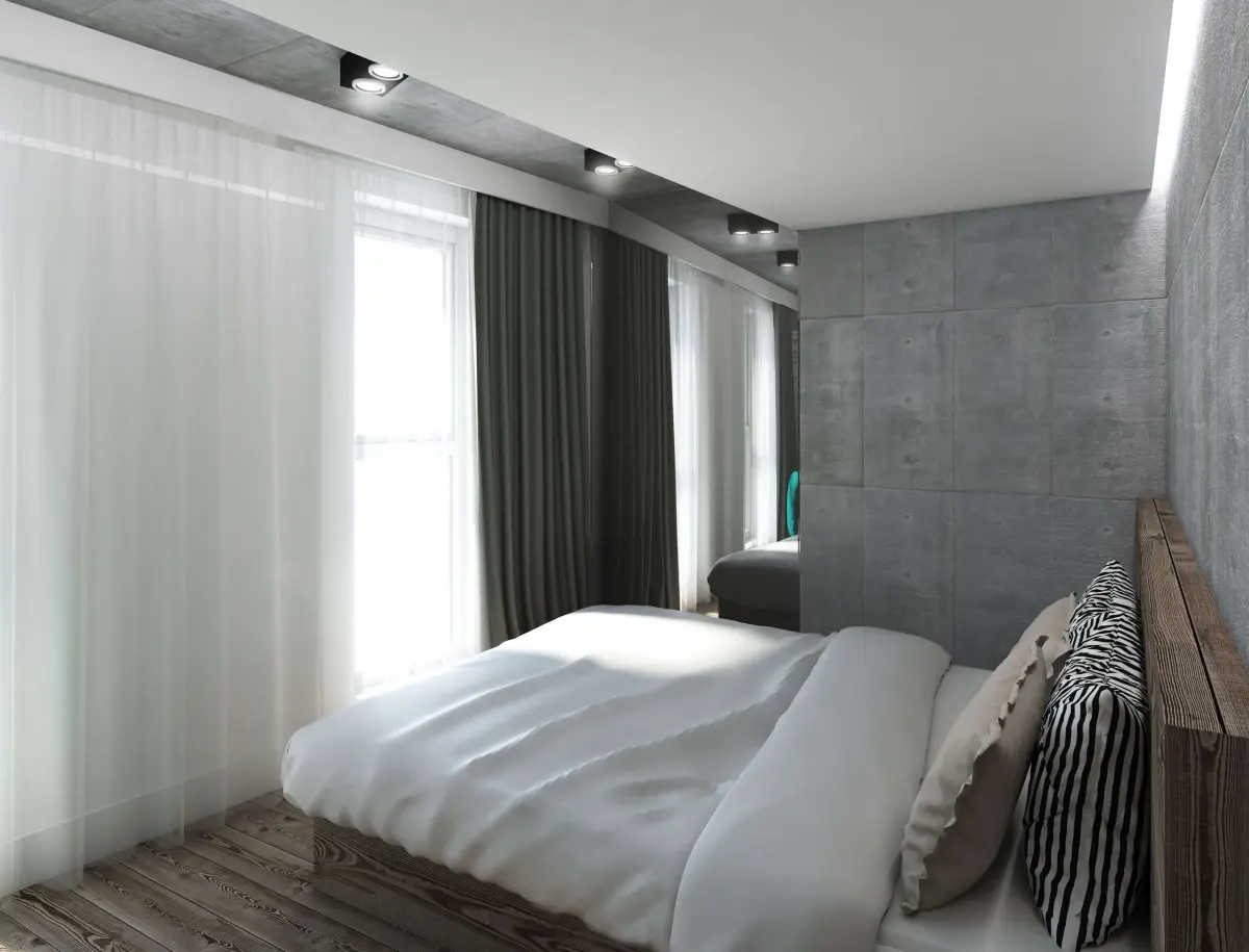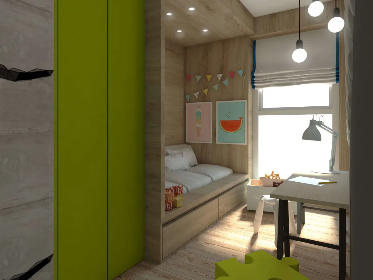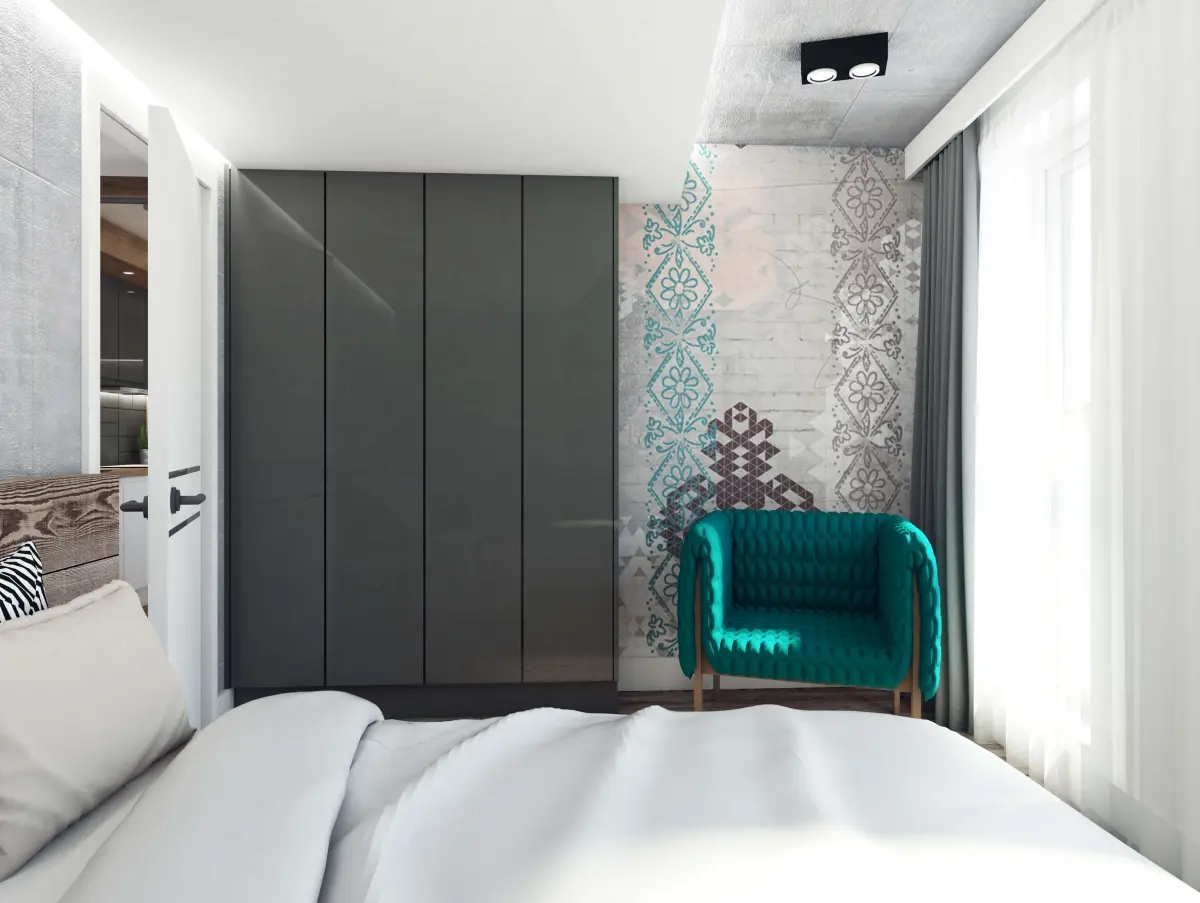 Mieszkanie dla rodziny „2+1”. Zaprojektowane wnętrze jest nowoczesne, ale przytulne. A to za sprawą naturalnych dodatków takich jak drewno, które doskonale kontrastuje z chłodnym betonem i szarościami. Charakteru dodają akcenty kolorystyczne, od przyjemnej mięty w salonie, przez turkus w sypialni, po zieleń w pokoju dziecka.