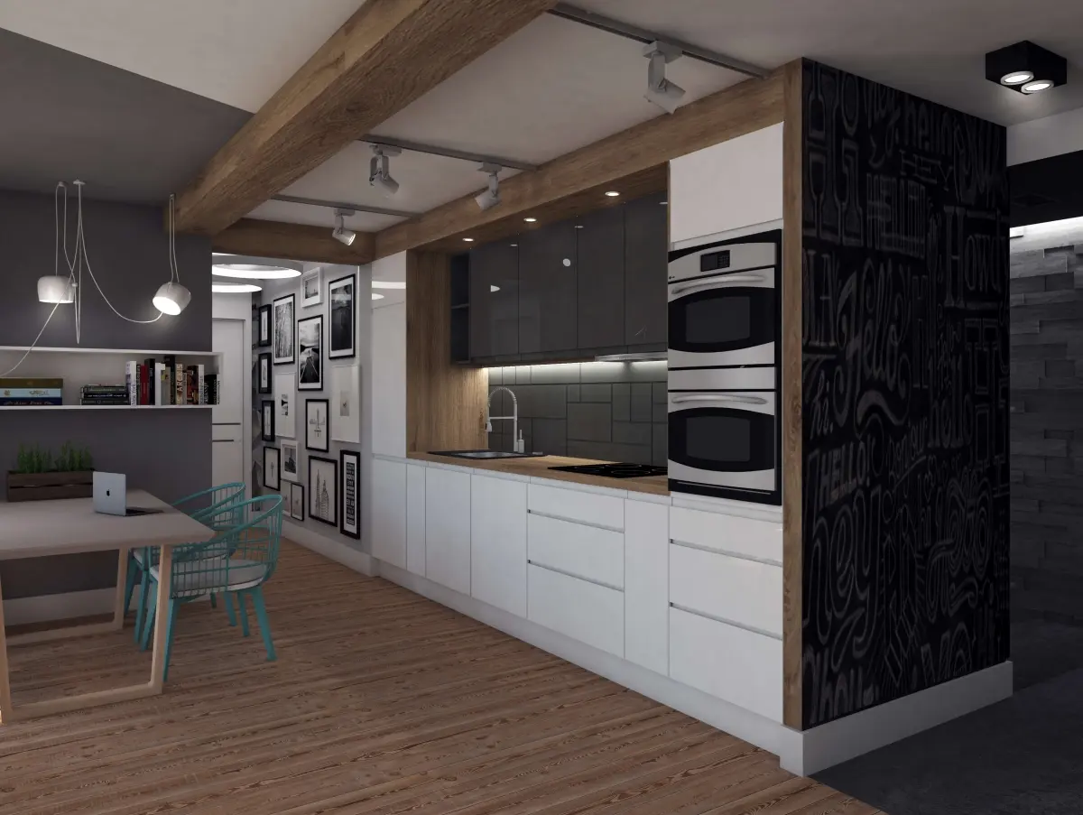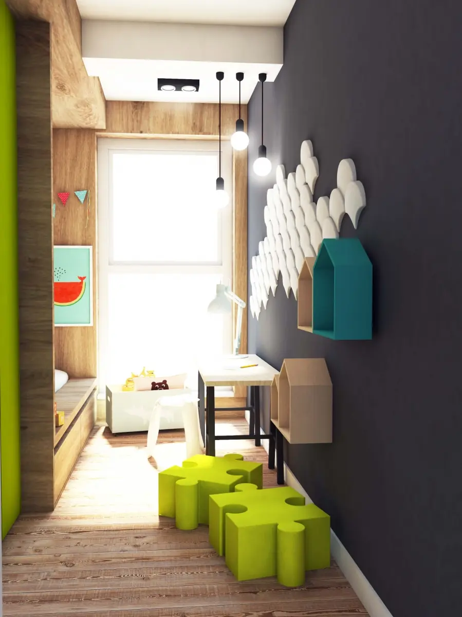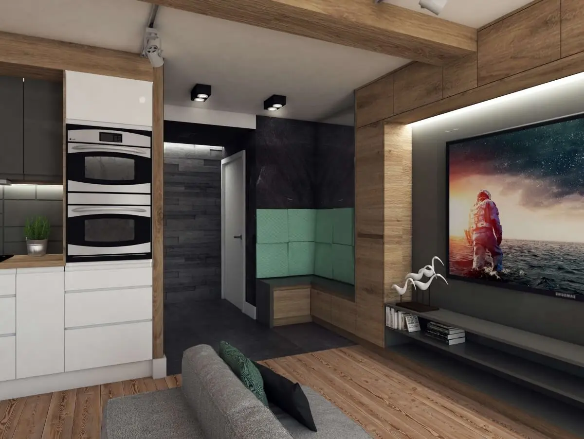 Mieszkanie dla rodziny „2+1”. Zaprojektowane wnętrze jest nowoczesne, ale przytulne. A to za sprawą naturalnych dodatków takich jak drewno, które doskonale kontrastuje z chłodnym betonem i szarościami. Charakteru dodają akcenty kolorystyczne, od przyjemnej mięty w salonie, przez turkus w sypialni, po zieleń w pokoju dziecka.