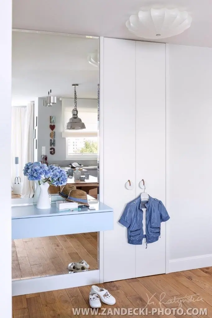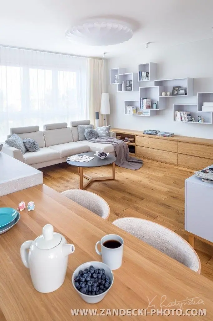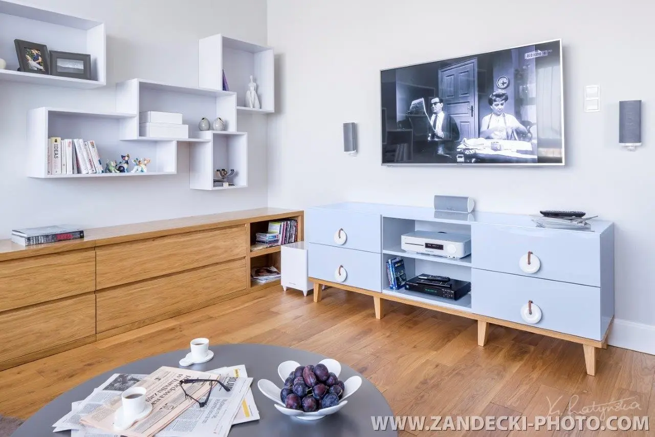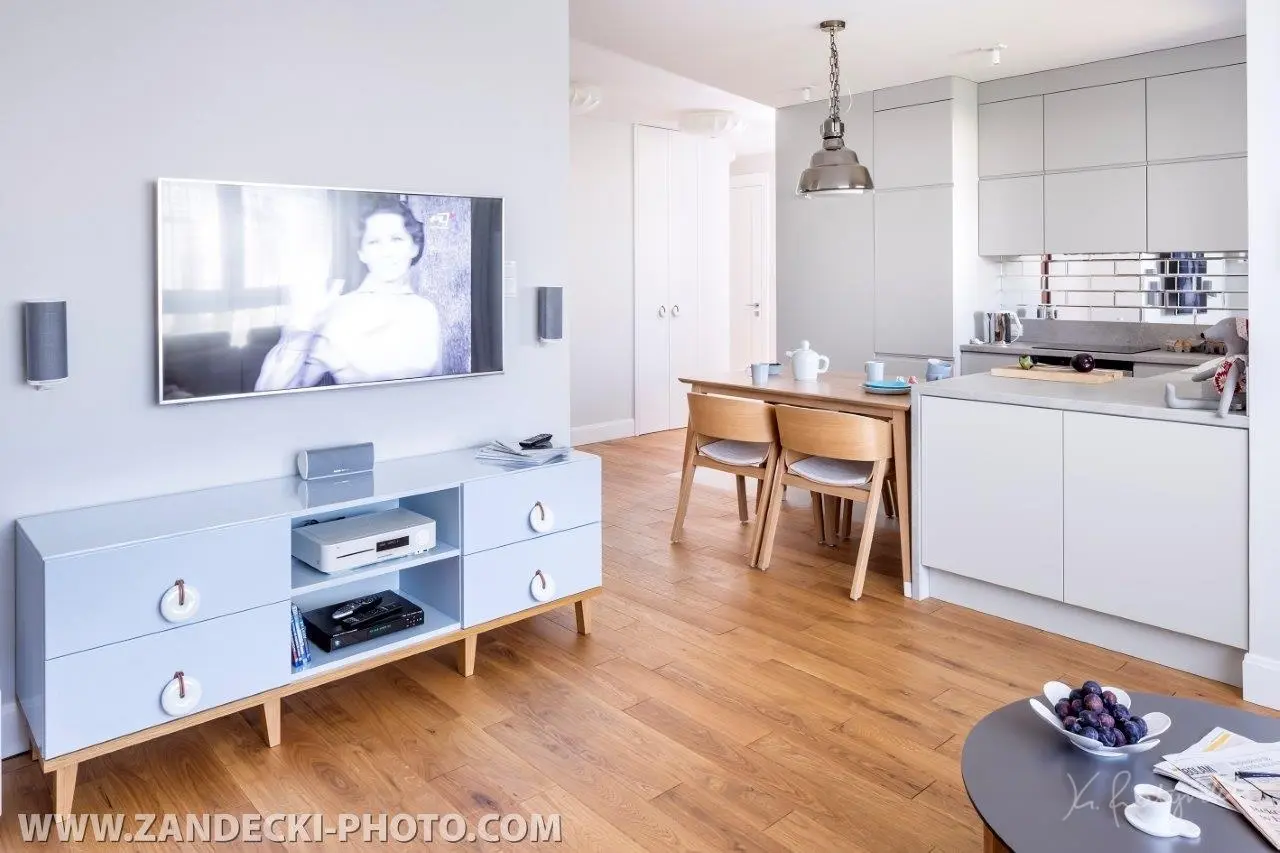 Projekt mieszkania nad jeziorem zlokalizowanego na… osiedlu Saska na warszawskiej Pradze Południe w sąsiedztwie zbiorników wodnych Balaton i Gocław. Mieszkanie zostało pomyślane w celu stworzenia zakątka, w którym można się wyciszyć i zrelaksować po ciężkim i stresującym dniu. Ot, oaza spokoju niemal w centrum wielkiego miasta. Wydaje się, że takie założenie zostało spełnione. Perłowa szarość zestawiona z łagodną bielą, jasnym drewnem i niebieskimi akcentami oraz duże okna, przez które światło przyjemnie wlewa się do wnętrza, działają niezwykle kojąco. Zobaczcie poniżej galerię zdjęć.