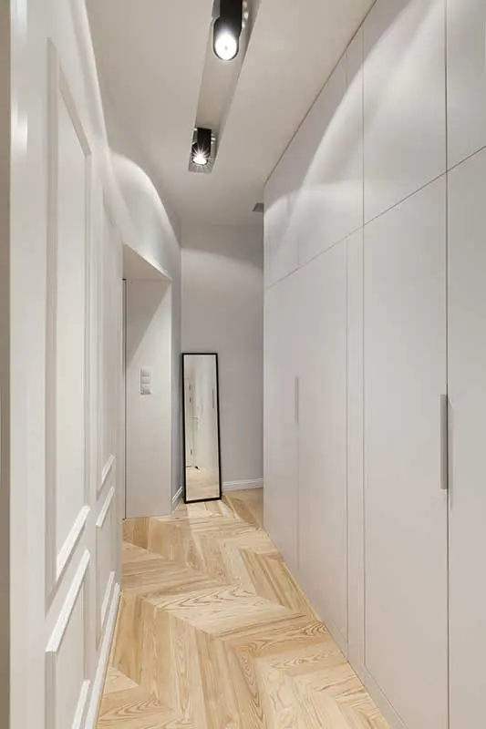 Przemyślanie zaplanowanie sporej przestrzeni pozwoliło na zagospodarowanie dużej ilości miejsca do przechowywania. Umieszczenie szafy za panelami, które pokrywają część ściany salonu czy korytarza, a także pomieszczenie gospodarcze, sprawiło że moduły te stały się niewidoczne.