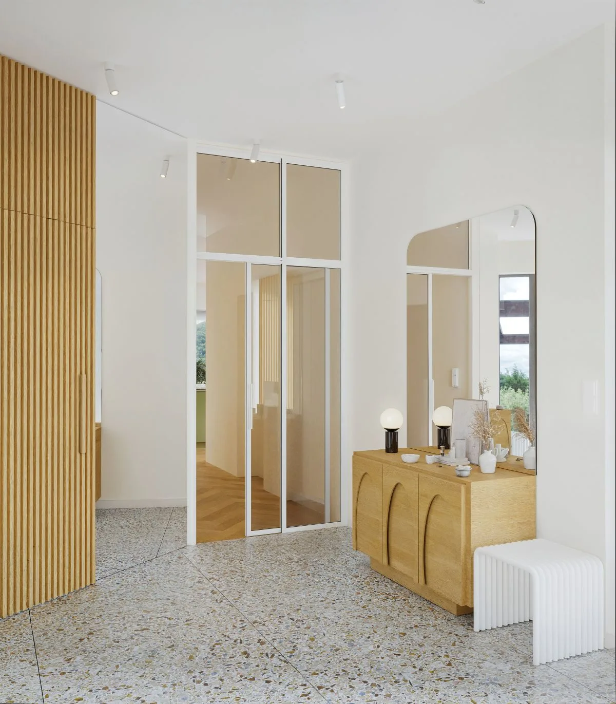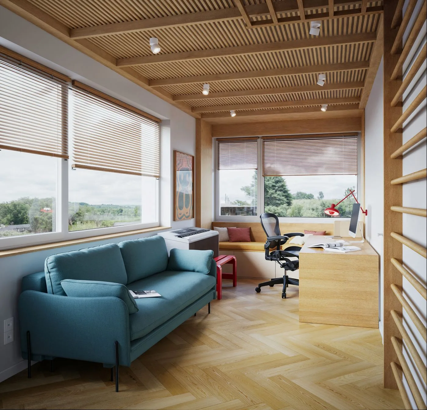 Całość projektu to swobodna gra formą i kolorem – świadome zestawienie strukturalnych akcentów, organicznych materiałów i odważnych barw, które nadają wnętrzu unikalny, pełen ekspresji charakter.