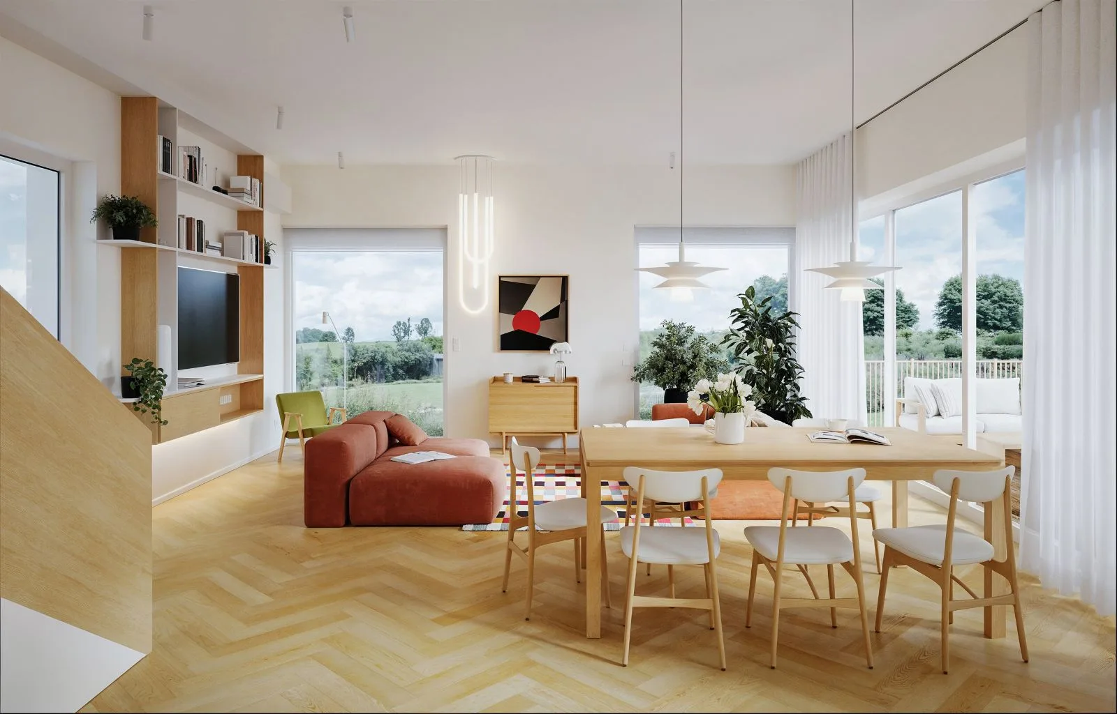Jednym z kluczowych założeń była harmonijna symbioza natury z designem. Aby wprowadzić zieleń w sposób integralny, zaprojektowaliśmy okap wyspowy z miejscem na bluszcz oraz szafkę RTV z otwartymi półkami, przeznaczonymi na kolekcję roślin. Strefa dzienna została wzbogacona o zabudowę biblioteczną, biegnącą wzdłuż klatki schodowej – marzenie Inwestorów, które nadało przestrzeni indywidualny charakter i głębię.