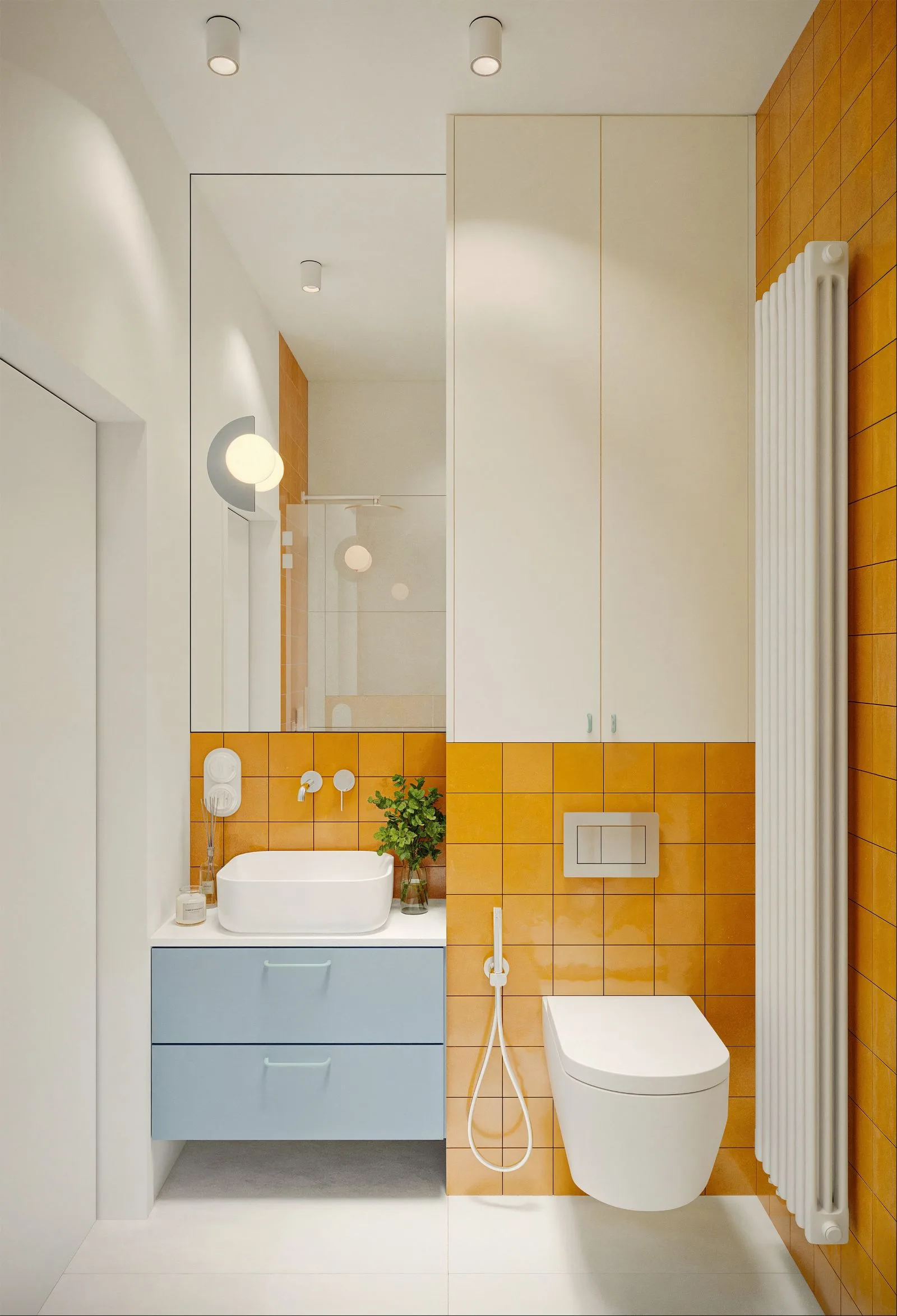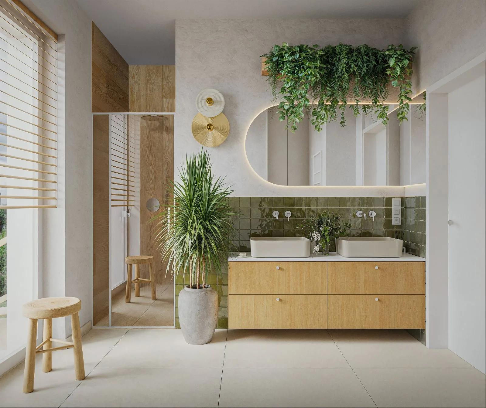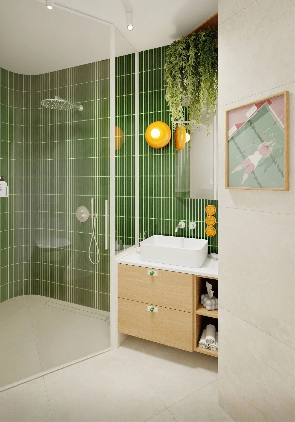 Szczególną rolę w projekcie odgrywają łazienki – każda z nich jest unikalna, ale wszystkie łączy spójna myśl przewodnia, inspirowana barwą i strukturą. Na parterze uwagę przykuwa łazienka w intensywnej zieleni, z zaokrągloną ścianą prysznicową i akcentami roślinnymi, które potęgują wrażenie świeżości i naturalnej energii. Łazienka przy sypialni Inwestorów to oaza relaksu, czerpiąca inspirację z balijskich wnętrz – ściana z tynku glinianego, zwisające rośliny i delikatne światło budują atmosferę domowego SPA. Z kolei ogólna łazienka na piętrze stawia na odważny dialog barw – intensywny pomarańcz w zestawieniu z błękitem tworzy elektryzujący i zapadający w pamięć kontrast.