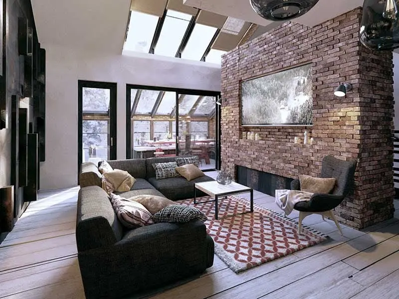 Dzięki jasnym kolorom i otwartej przestrzeni uzyskano przestronność, którą potęgują przeszklenia z widokiem na ogród. Głównymi materiałami użytymi we wnętrzu są patynowana czarna blacha oraz naturalna cegła.