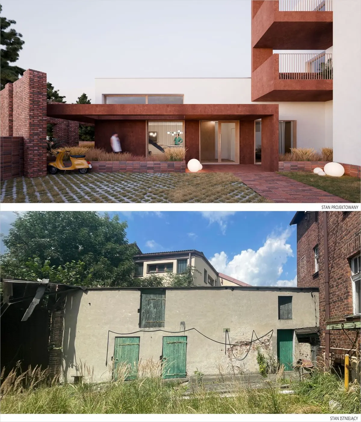 Rozpoczynając od koncepcji, inwestorzy wraz z biurem projektowym GIGAarchitekci ze Śląska podjęli decyzję o kompleksowym oczyszczeniu terenu i adaptacji nieużytkowanych obiektów gospodarczych na nowe funkcje mieszkalno-rekreacyjne. Znaczącym elementem projektu było zachowanie charakterystycznej ceglanej elewacji frontowej, a także modernizacja wnętrz zgodnie z obecnymi standardami użytkowymi.