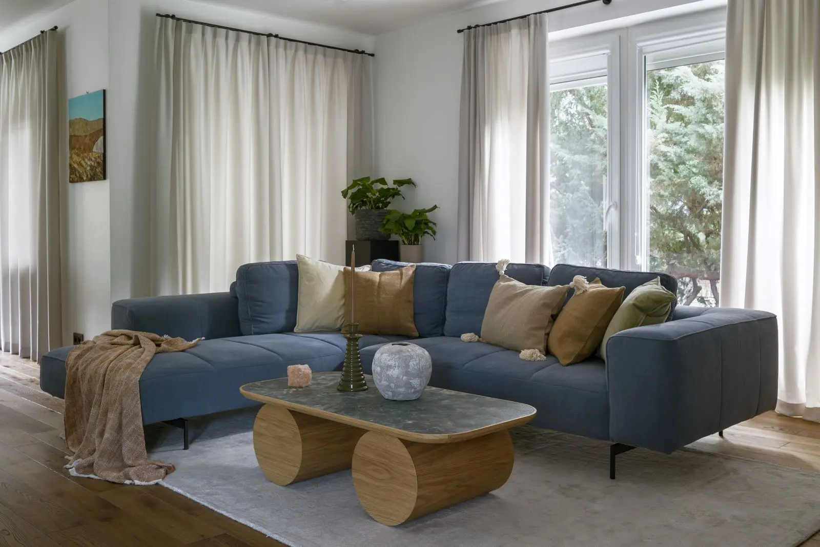 Akcenty błękitu, które stały się motywem przewodnim wnętrza, pojawiają się punktowo, nadając przestrzeni charakteru. Hokery przy wyspie kuchennej marki &Tradition, znajdująca się na blacie rzeźba autorstwa Arka Szweda oraz lampy Multi-Lite duńskiej marki GUBI – to tylko niektóre z elementów, które podkreślają spójność stylistyczną projektu.