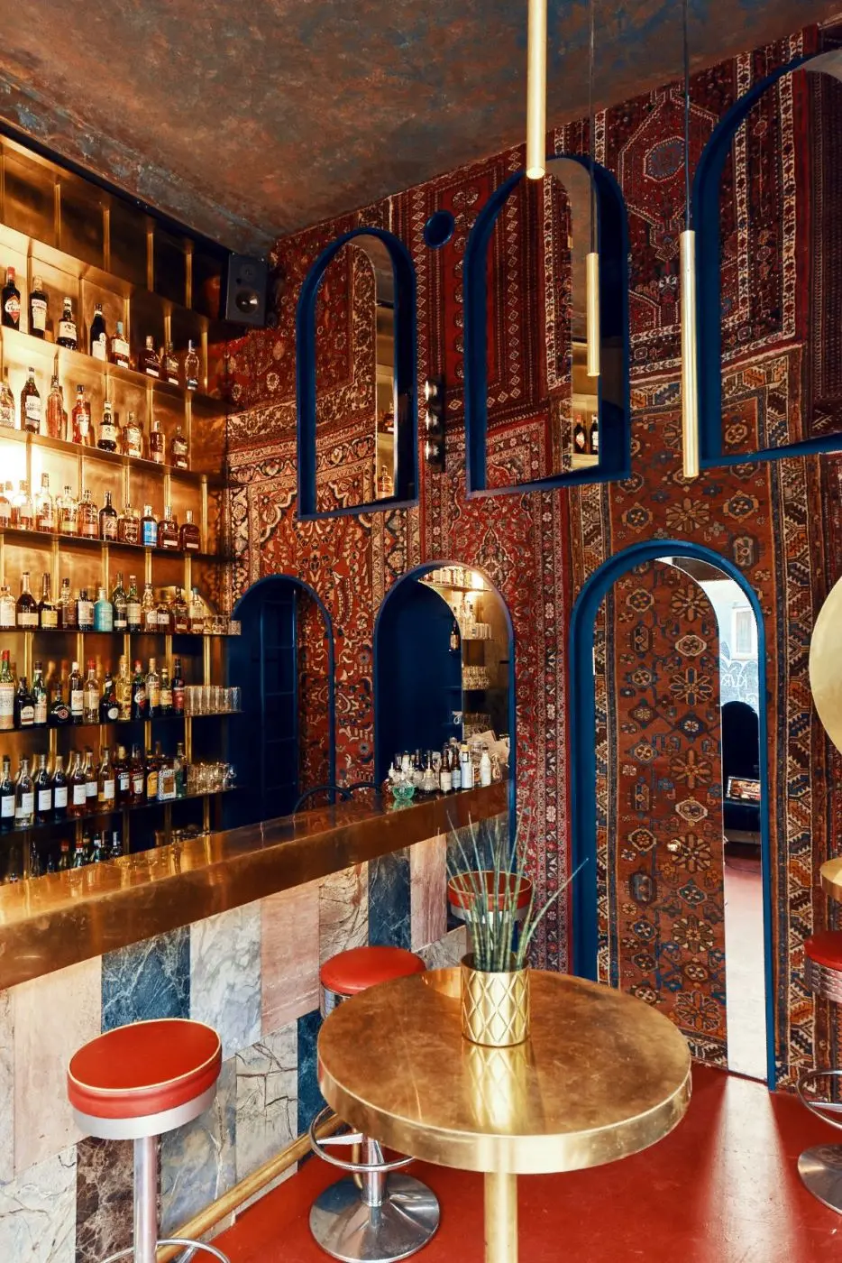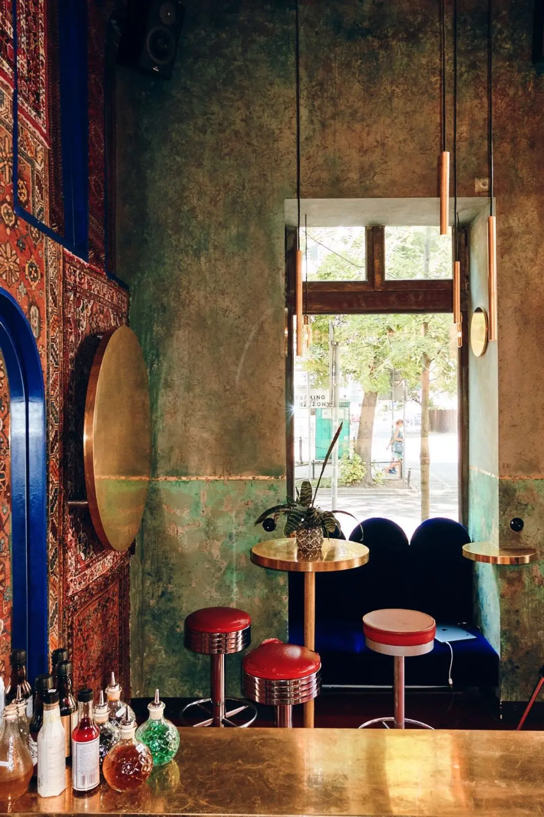 Z kolei w barze Aura projektant wprowadził elementy drobnego rzemiosła, typowego dla lokalizacji lokalu. Tapicerka powstała więc w pracowni rzemieślnika z sąsiedztwa, na miejscu wykonano też detale z mosiądzu, a kamienne płyty okładzinowe baru pochodzą od kamieniarza jednego z warszawskich… cmentarzy. Ponoć pozostały one po niezrealizowanym zamówieniu…
