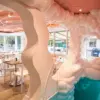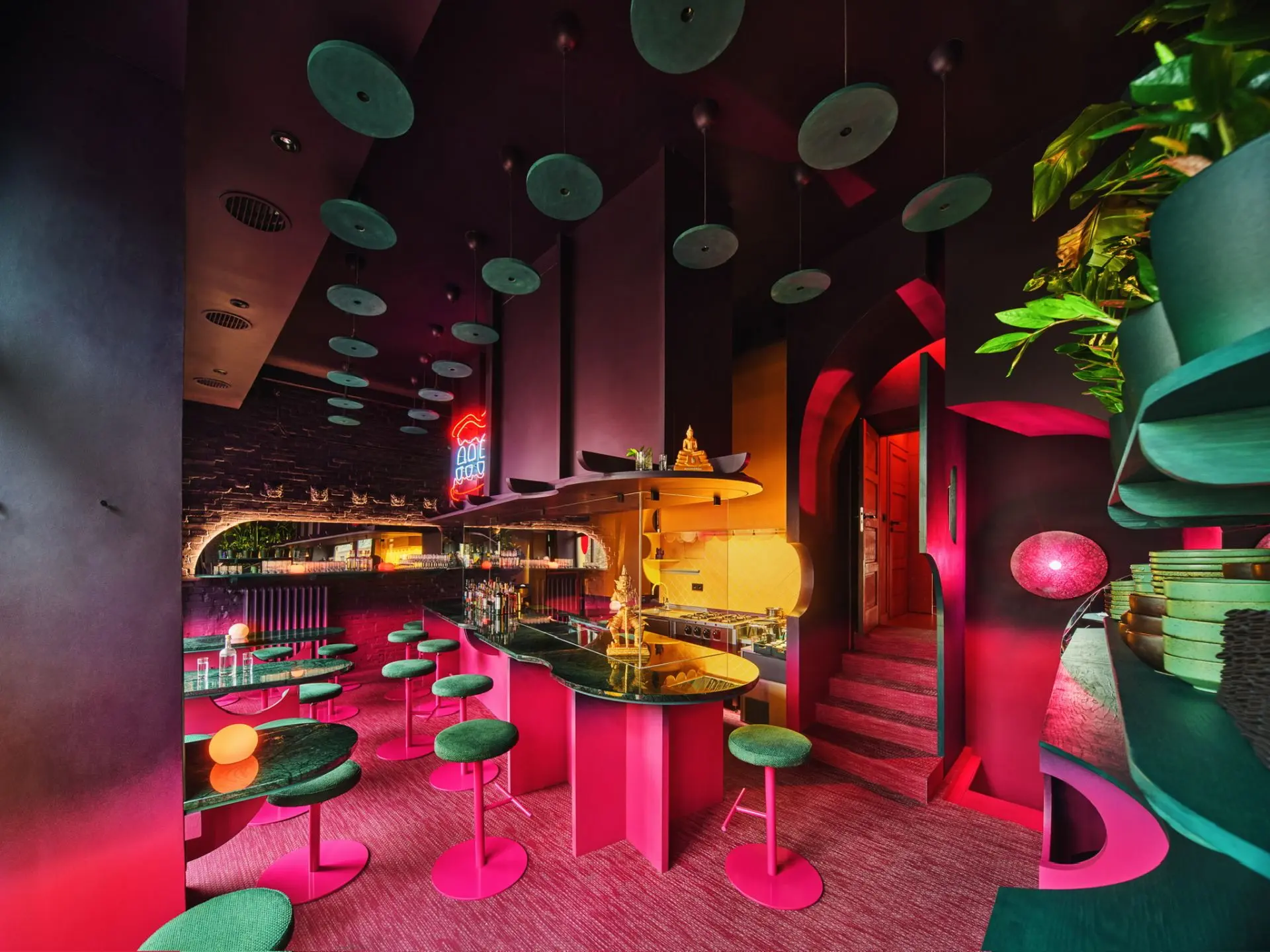 Dodatkowo – inspirując się twórczością Fangora i tworząc optyczne iluzje, projektant wprowadził do wnętrza wrażenie ruchu i dynamiki. Przy tym, jak przystało na iście teatralną scenografię, nie zabrakło tam również licznych rekwizytów. Srebrzysta lampa Zofii Strumiłło nawiązująca do motywów planetarnych Fangora, murale autorstwa Kamili Lipke, a do tego identyfikacja wizualna zaprojektowana przez Michała Korolca dopełniły wystrój tego mocno zindywidualizowanego wnętrza.