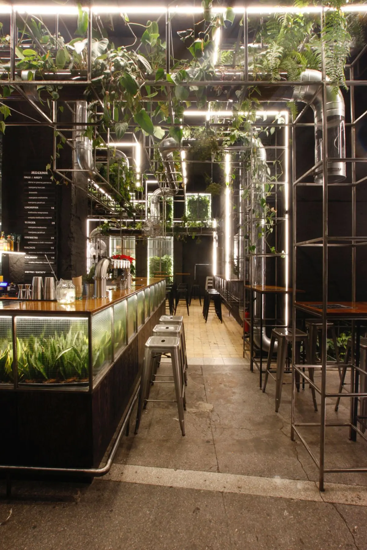 Natomiast w drink barze Foton, mieszczącym się w XIX-wiecznej kamienicy, w centrum Warszawy, uwagę przykuwa charakterystyczna stalowa konstrukcja opleciona bujną roślinnością, czym odwołuje się do modnego obecnie w przestrzeniach publicznych trendu biofilii.