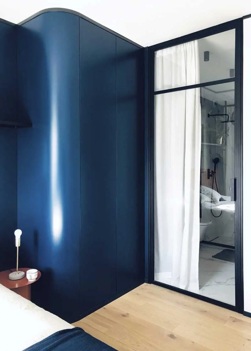 Architektki ze Studio Brzask zadbały, także o komfort rodziców. Ich część prywatna oddzielona jest od pokojów dzieci salonem. Takie rozmieszczenie pozwoliło na stworzenie wygodnych stref dla każdego z domowników, co jest tak potrzebne w dzisiejszych czasach. Na przestrzeń rodziców składa się wygodna sypialnia oraz łazienka. Dominuje tutaj stylistyka inspirowana modernizmem i Bauhausem. Ciemnoniebieska zabudowa szafy o zaoblonej formie, przechodzi w ścianę za łóżkiem. Wysokie przeszklone drzwi w metalowej ramie, prowadzą do łazienki. Jej wnętrze pokrywają spieki o teksturze marmuru. Szafka umywalkowa z frontem w kolorze zgaszonej czerwieni, idealnie koresponduje z błękitem w sypialni. Prysznic typu walk-in wydziela szyba w czarnych profilach. Całość aranżacji uzupełnia prosta, czarna armatura.
