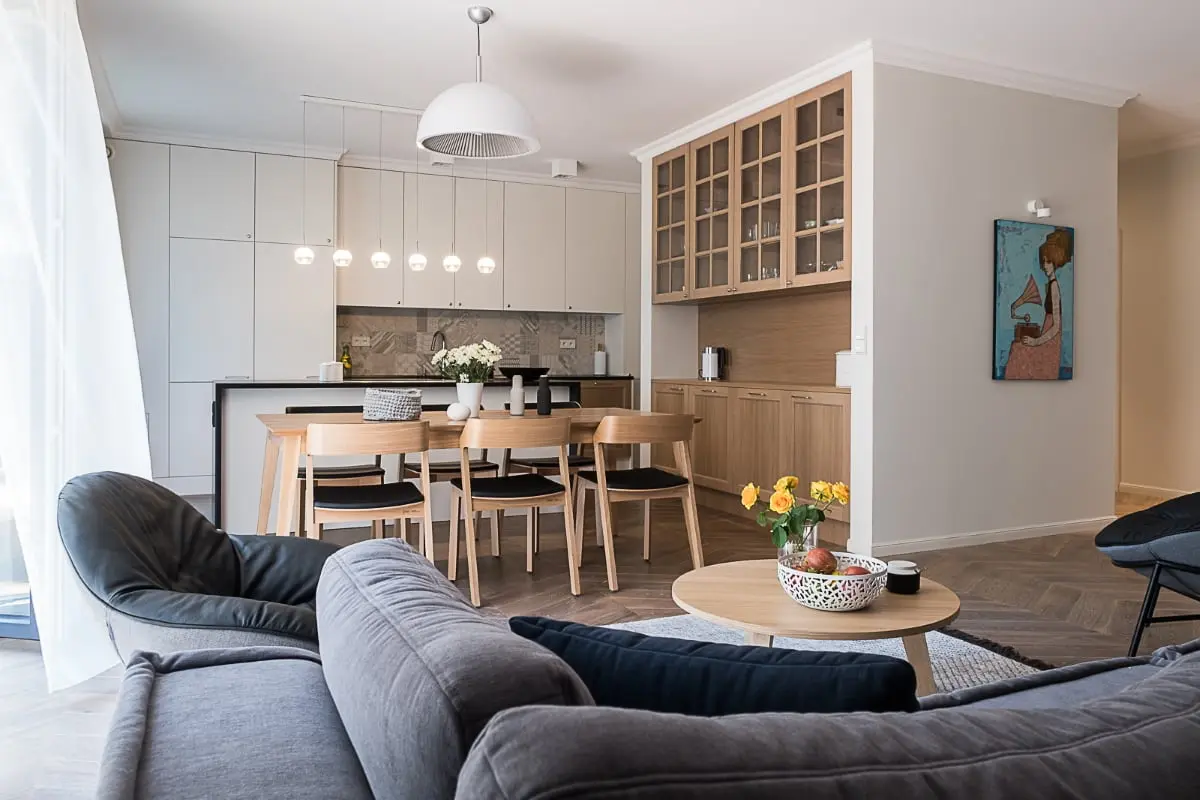 Bielany to jedna z najspokojniejszych i najbardziej zielonych dzielnic Warszawy. Nie brakuje w niej też malowniczych zakątków z zabytkową zabudową – wymarzonych na niedzielne spacery. W ciągu tygodnia natomiast wielkim walorem tej części miasta jest wygodny dojazd do centrum. Nic dziwnego, że właśnie tu zdecydowała się osiąść para inwestorów z dwojgiem dzieci i… kolejnymi w planach. Znaleźć w ofercie deweloperów odpowiednio duży metraż nie było łatwo. Stanęło więc na zakupie dwóch sąsiadujących mieszkań z wyjściem do ogródka. Połączenie ich w spójną, harmonijną i wygodną całość stało się kluczowym, choć nie jedynym wyzwaniem w aranżacji tej przestrzeni. W tym mieszkaniu na pierwszym miejscu są ludzie i relacje między nimi. Takie spojrzenie na to wnętrze przyświecało projektowi, wyznaczało dobór materiałów i układ funkcjonalny mieszkania. Wszystko po to, by bielański apartament dobrze służył rodzinie inwestorów przez długi czas, odpowiadał na wyzwania codzienności i dopasowywał się do zmieniających się potrzeb.