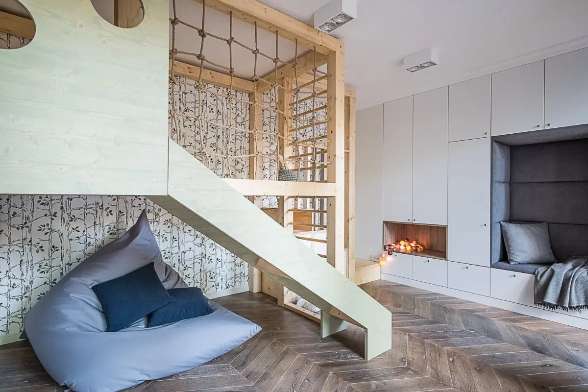 Wyjątkowe przeznaczenie mają wnętrza powstałe w mniejszym z dwóch pierwotnych mieszkań. Jedno z nich łączy w sobie funkcje gabinetu, pokoju gościnnego oraz prywatnej sali kinowej z rzutnikiem i rozwijanym ekranem. Dlatego m.in. stanęła tu rozkładana kanapa, która jednak częściej niż nocującym gościom służy domownikom zasiadającym do oglądania starannie wybranych filmów. Stąd też przechodzi się do kolejnego pomieszczenia – pokoju zabaw. Najważniejszym jego elementem jest konstrukcja łącząca w sobie elementy zjeżdżalni, drabinki, sieci do wspinania się i „bazy” poniżej. Całość ma charakter samonośny, więc w przyszłości bez dużych nakładów będzie można urządzić tutaj np. domową siłownię albo dodatkową sypialnię. Z myślą o tym, tak jak i w pokojach dziecięcych, pojawiły się tu te same, co w całym domu, materiały, kolory i wykończenia. Swe przeznaczenie łatwo zmieni także obszerna zabudowa, która dziś pozwala utrzymać w porządku niemal dowolną liczbę zabawek.