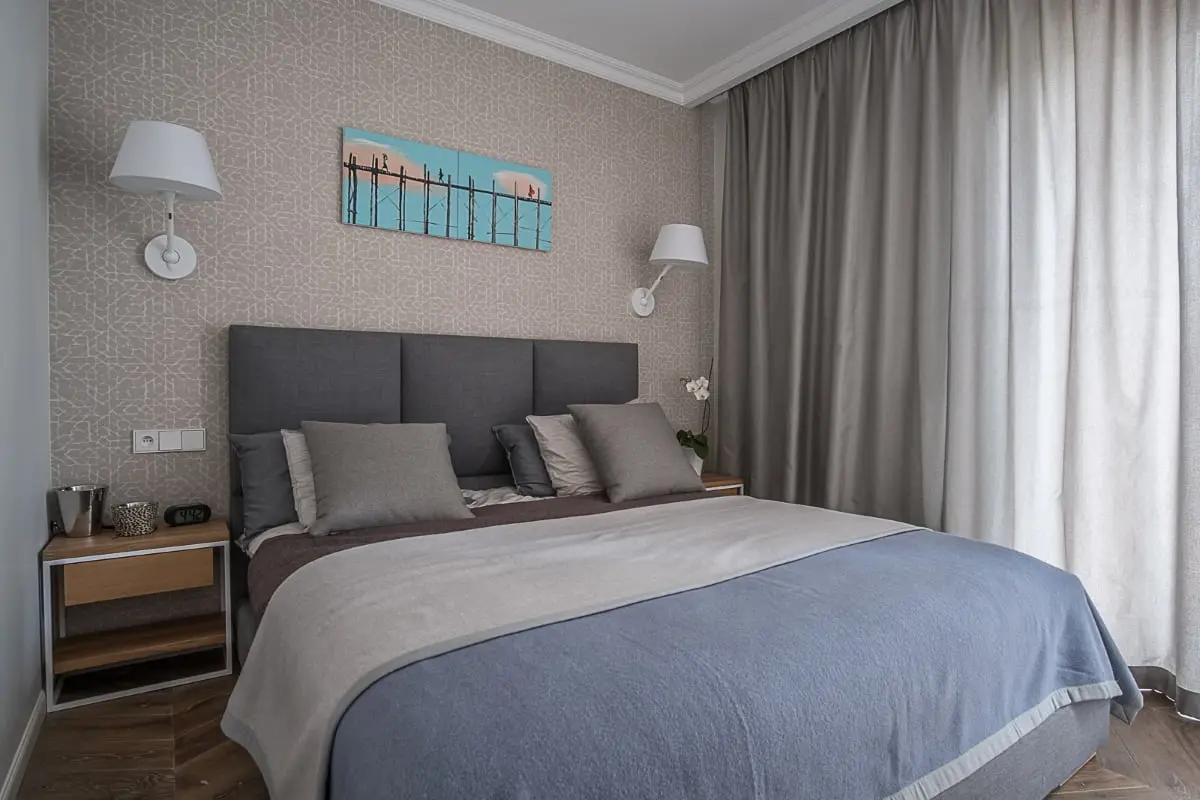 Niewielką sypialnię bez mała wypełniło szerokie, wygodne łóżko z miękkim, tapicerowanym zagłówkiem. „Centralne usytuowanie tego mebla podkreśla główną funkcję pomieszczenia” – zaznacza architekt. Główną, ale nie jedyną, bo choć nie ma tu np. miejsca do pracy, ścianę naprzeciwko łóżka wypełniła minimalistyczna szafa. Za sprawą lekkich, dyskretnych, nowoczesnych form aranżacja sprzyja wyciszeniu i regeneracji.