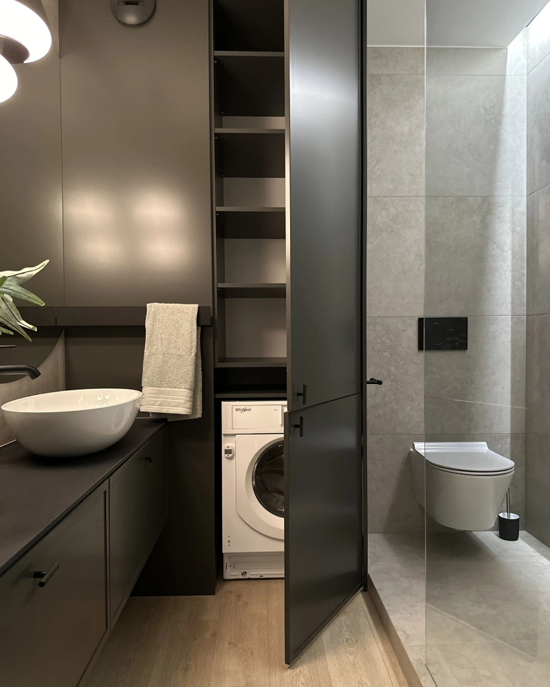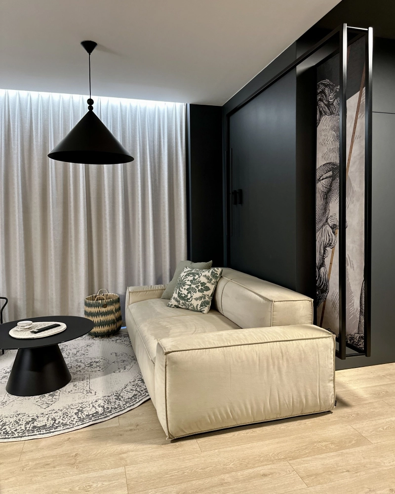 Wiodącymi elementami kompozycji wnętrz są grafit, biel oraz odważne wykorzystanie drewna, szczególnie w kontekście intensywnego koloru grafitowego. Projektantki zdecydowały się na subtelne, ale strategiczne użycie kolorów, przy czym grafit zrównoważono delikatnymi akcentami odcieni mebli, tapicerki i zasłon. Wprowadzając akcenty kolorystyczne, projektantki miały na uwadze różnorodność gustów przyszłych najemców. Stąd decyzja o ograniczeniu barwnych elementów do subtelnych dodatków w postaci zieleni i miodu, które stopniowo przechodzą w złote akcenty. Świadoma kompozycja pozwala na stworzenie przestrzeni, którą łatwo dostosować do preferencji wynajmujących, poprzez proste zmiany wyposażenia, takie jak wymiana krzeseł czy poduszek dekoracyjnych.