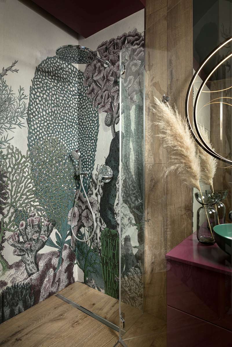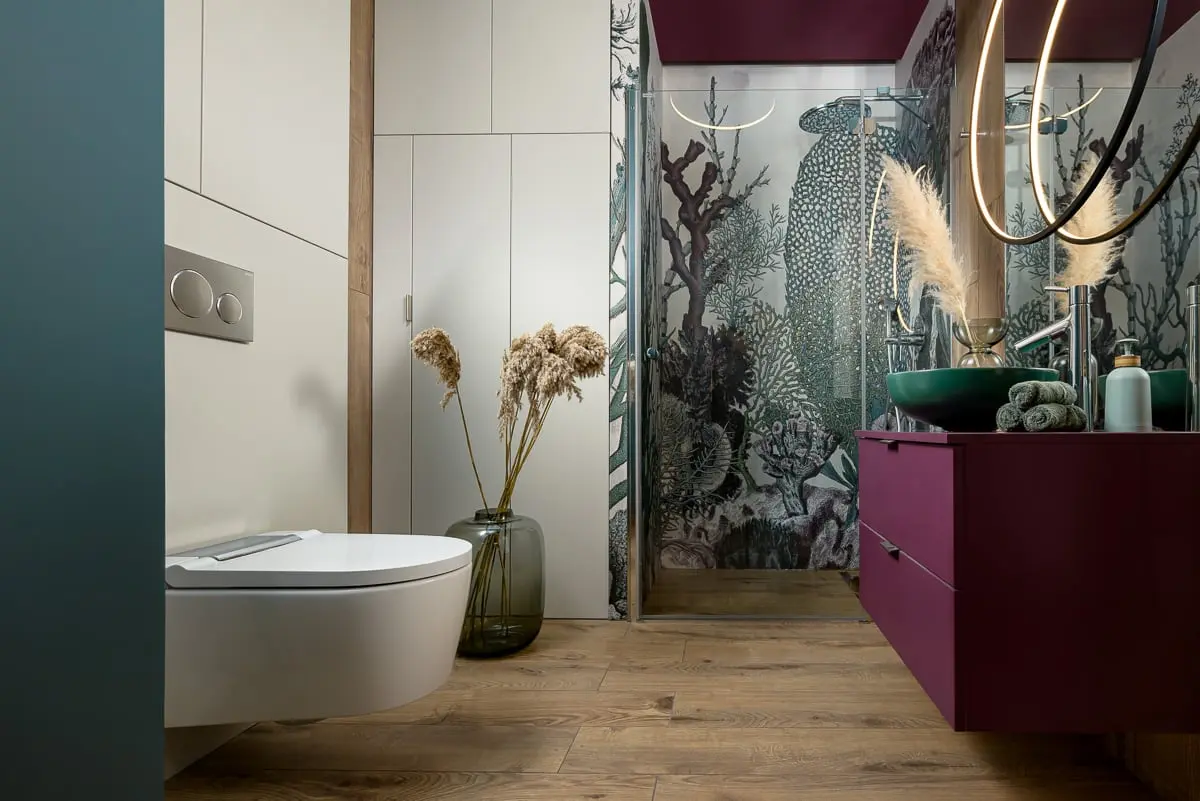Druga z łazienek sąsiaduje z pokojem syna i pozostaje z nim spójna kolorystycznie. Założeniem autorki było stworzenia wnętrza sprzyjającego relaksowi, a równocześnie efektownego i eleganckiego. W tym celu ograniczyła do minimum płaszczyzny kafli – pojawiają się jedynie przy umywalce i toalecie – podczas gdy resztę powierzchni zdecydowała się pokryć farbą. W pomieszczeniu dominuje głęboki turkus oraz zieleń butelkowa i oberżyna zaczerpnięte z muralu przedstawiającego detal rafy koralowej, którym projektantka wykończyła strefę prysznicową. – Zestawiłam go z podłogą z płytek imitujących drewno – całość zyskała charakter salonu kąpielowego i to nie tylko za sprawą graficznej dekoracji, lecz także dzięki zamontowaniu pod prysznicem niemal niewidocznego na tle posadzki odpływu liniowego Geberit CleanLine. Wyróżnia się on minimalistyczną urodą delikatnej formy ze szczotkowanej stali, ale i niezwykłymi walorami funkcjonalnymi. Jeśli chodzi o łatwość utrzymania czystości, co było priorytetem dla inwestorów, to dzięki konstrukcji nie posiadającej zakamarków, gdzie gromadziłyby się zanieczyszczenia CleanLine jest niezastąpiony – podsumowuje Monika Staniec.