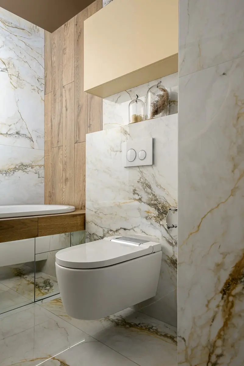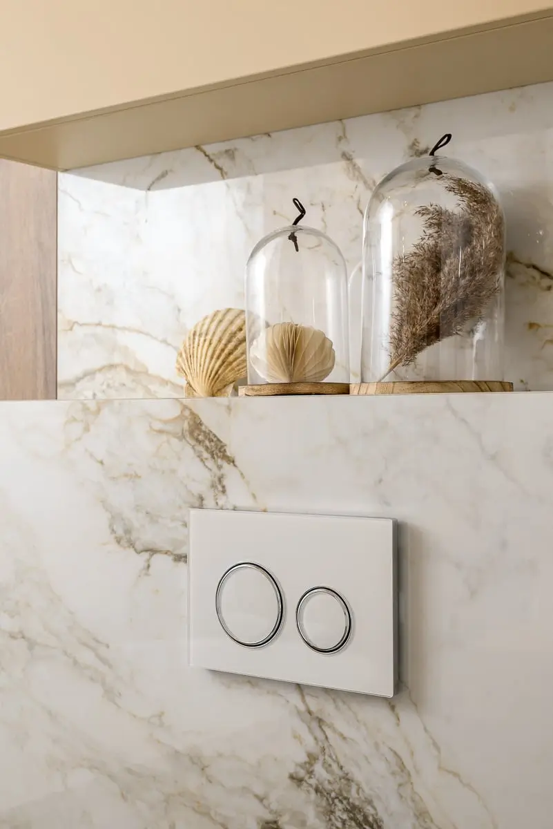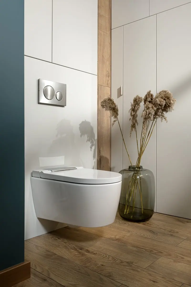 Chociaż natura, jako inspiracja, gra pierwsze skrzypce w przestrzeni obu łazienek to i tutaj technologia odgrywa kluczową rolę. Wyposażono je bowiem w toalety myjące Geberit AquClean Sela – unikatowe rozwiązanie, które w nowoczesnej i eleganckiej formie łączy funkcję WC z inteligentnym bidetem. Dodatkowo zastosowano system Geberit DuoFresh współpracujący z przyciskami spłukującymi Geberit Sigma zintegrowanymi ze stelażem. – Geberit DuoFresh to rozwiązanie pochłaniające nieprzyjemne zapachy z toalety – objaśnia projektantka – dzięki niemu nie musimy używać zawieszek w obrębie misy WC. Montujemy jedynie system, który umożliwia odciągnięcie przycisku i włożenie do wewnątrz kostki – niebieskiej albo zielonej. Woda przybiera wybrany kolor równocześnie oddając delikatny zapach – opowiada projektantka. Właściciele, jako pasjonaci nowoczesnych technologii, niezwłocznie zainstalowali aplikację pozwalającą kontrolować działanie toalety myjącej Geberit AquaClean, w tym funkcję rozpoznawania osoby – wystarczy usiąść i misa „wie” czy to mężczyzna czy kobieta, automatycznie wysuwając cześć bidetową męską albo damską. – Pan domu jest gadżeciarzem – śmieje się projektantka – uwielbia kontrolować wszystko z pozycji smartfonu. A że mają aż dwie „inteligentne miski WC” to w sumie może zostać przez nie rozpoznanych aż dziesięć osób – żartują więc, że nawet kiedy przyjdzie cała rodzina to miska będzie „wiedziała”, kto na niej usiadł.