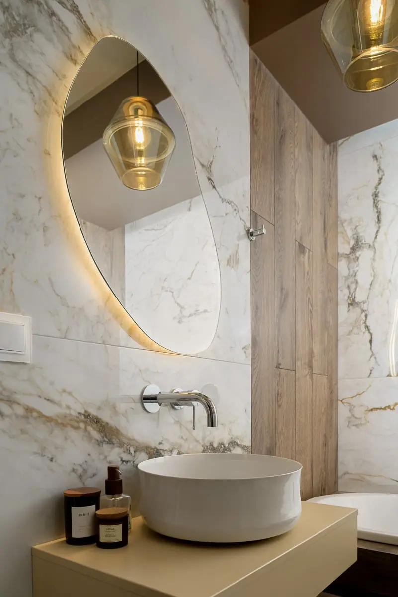 Motywy zaczerpnięte z natury szczególnie wyraziście zaistniały we wnętrzach obu, zróżnicowanych kolorystycznie, łazienek. – Łazienka główna miała być spójna stylistycznie z otwartą częścią dzienną – tłumaczy autorka aranżacji – dlatego w kuchni i w łazience zastosowałam ten sam gres, do złudzenia przypominający marmur – opowiada. W obu łazienkach motyw drewna pojawia się w postaci naśladujących naturalny materiał kafli. W głównej architektka zastosowała lustro jako wykończenie wanny w celu optycznego powiększenia pomieszczenia. – Uzupełniłam je oświetleniem ledowym, co umożliwia stworzenie kameralnej atmosfery podczas kąpieli, szczególnie wówczas, gdy wyłączy się światło górne, a zamiast niego zapali świecę na obudowie wanny – dodaje Monika Staniec.