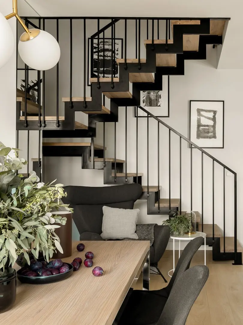 Pomimo, że w salonie, który i tak jest dość mały, musiało się znaleźć miejsce na schody, wraz z ażurkową balustradą, stanowią ozdobę strefy dziennej.