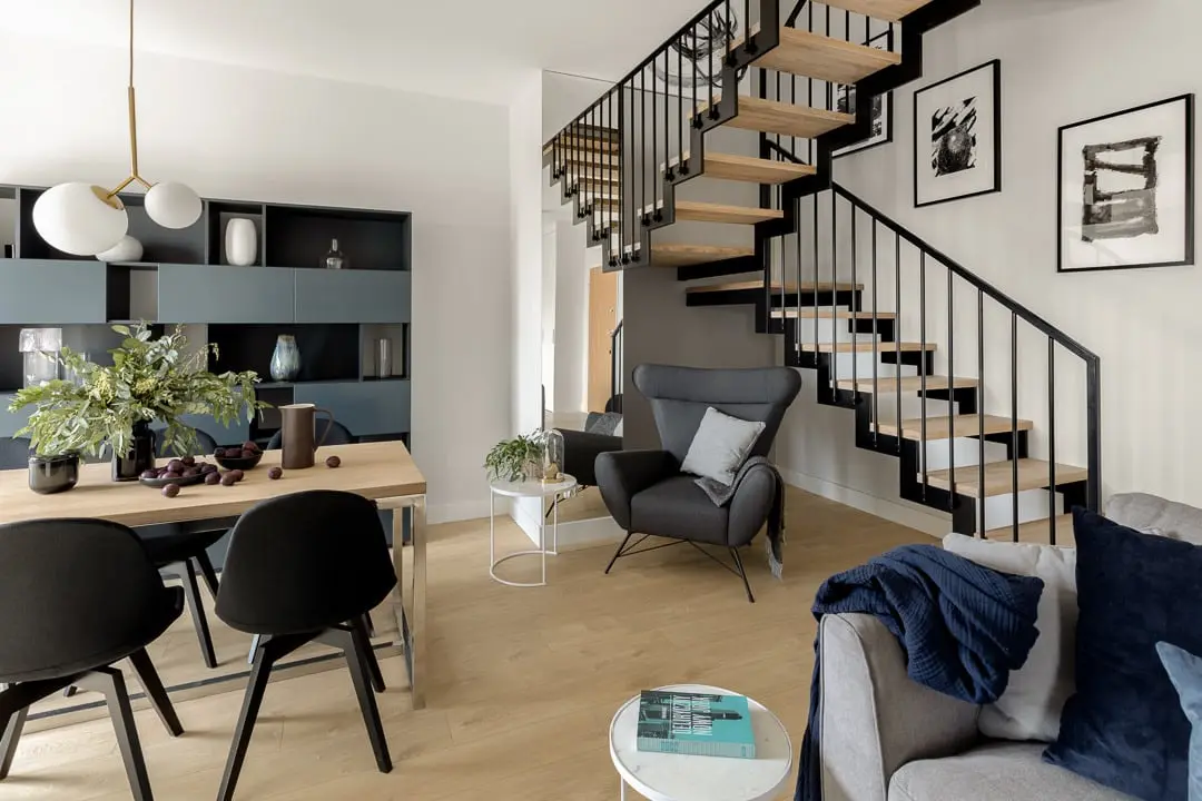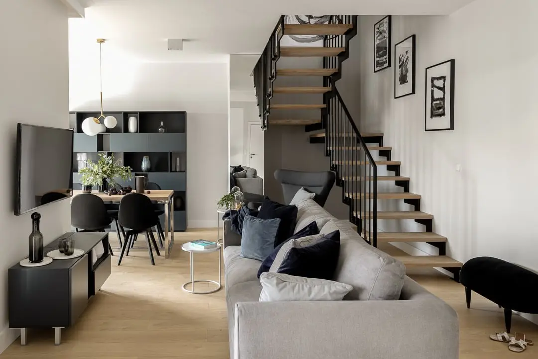 W strefie dziennej, na którą składa się salon, jadalnia i kuchnia, dominują neutralne, stonowane kolory, gdzieniegdzie przełamane akcentami czerni i granatu. Dzięki temu przestrzeń jest delikatna, ale nie nudna. Przemyślane zabiegi projektowe, takie jak zastosowanie mebli na nóżkach, sprawiają, że wnętrze jest pełne lekkości.
