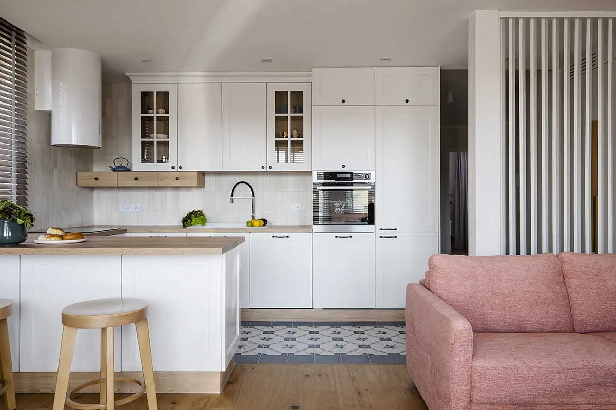 Posadzka w kuchni jest kontynuacją wzoru z korytarza, co wizualnie spaja oba pomieszczenia. Białe frezowane fronty zabudowy kuchennej dobrze łączą się z ciepłym wybarwieniem drewna. Całość kompozycji kolorystycznej uzupełnia delikatna płytka ścienna w odcieniach beżu. Blat kuchenny przechodzi w półwysep, przy którym znajduje się dodatkowe miejsce do pracy oraz spożywania posiłków.