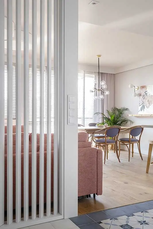 Jak opowiadają architekci, po analizie rzutów od dewelopera zdecydowano się na zmianę lokalizacji aneksu kuchennego, co pozwoliło zaaranżować przestrzeń korzystniejszą dla inwestorów. Strefę wejściową zaznaczono ciekawymi kaflami z ornamentem układającym się w mozaikę dywanową. Hol jest oddzielony od salonu ażurową ścianką doświetlającą pomieszczenie oraz dodatkowo nakierowującą nas na przestronny aneks kuchenny.