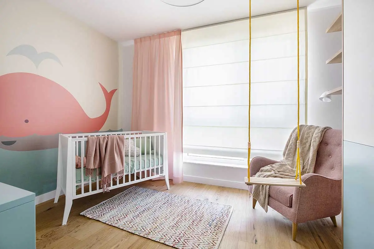 Pokój niemowlaka zaprojektowano z myślą o rozwijaniu wyobraźni dziecka. Uniwersalna zabudowa stolarska w żywych kolorach będzie służyć dziecku przez wiele lat. Kolor wody na tapecie z wielorybkiem został kontynuowany za sprawą farby kredowo – magnetycznej.
