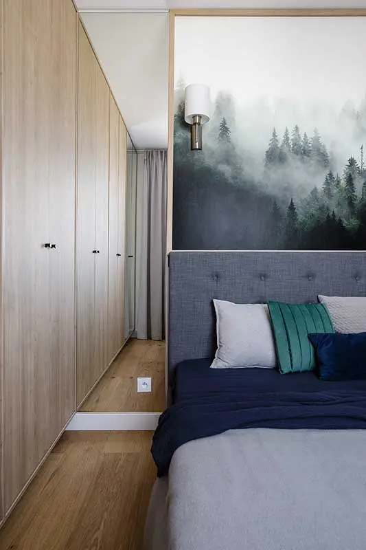 Sypialnia rodziców to miejsce do odpoczynku, dlatego centralne miejsce zajmuje tapicerowane łóżko. Projektantom udało się także zmieścić duże szafy na całą wysokość pomieszczenia oraz biurko. Lustra pojawiające się na frontach i ścianie optycznie powiększają pomieszczenie, któremu smaku dodaje tapeta w drewnianej ramie nad łóżkiem.