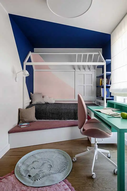 W pokoju pięciolatki zaprojektowano łóżko na podwyższeniu, spełniając tym samym marzenie starszej córki. Konstrukcja w kształcie domku kryje w sobie dodatkowe miejsce do przechowywania. Tapicerowany stopień pełni równocześnie funkcję siedziska. Bok pojemnych szaf wzbogacono o listwy, za którymi można przechowywać pluszaki i książki. Pod kolorową tapetą znalazła się także farba kredowo – magnetyczna zachęcająca do kreatywnej zabawy.