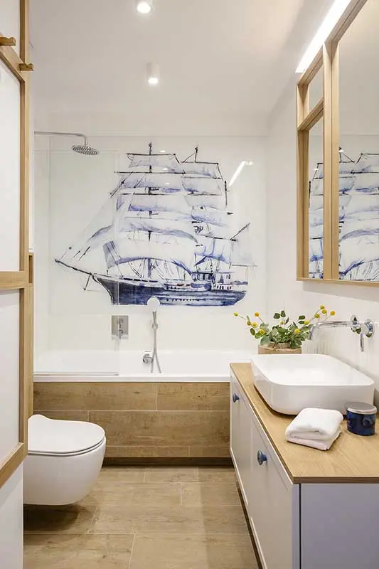 W łazience pojawiają się niebieskie i morskie motywy występujące wcześniej w pozostałych pomieszczeniach. Akwarelowy statek wydrukowano na hartowanym szkle. Zdecydowano się na nawiązanie płytkami do dębowej podłogi w pozostałych pomieszczeniach. Z drewnianych listewek zaprojektowano lustro w drewnianej ramie i wieszak na ręczniki.