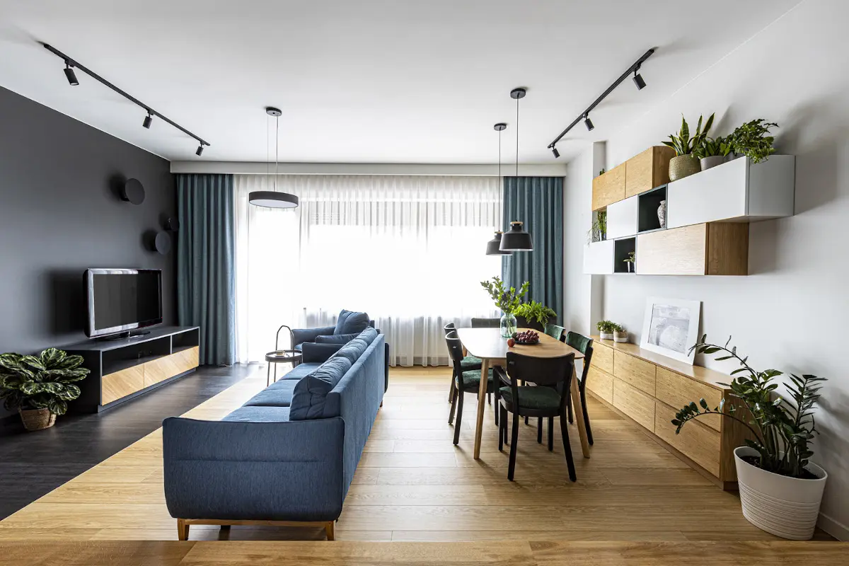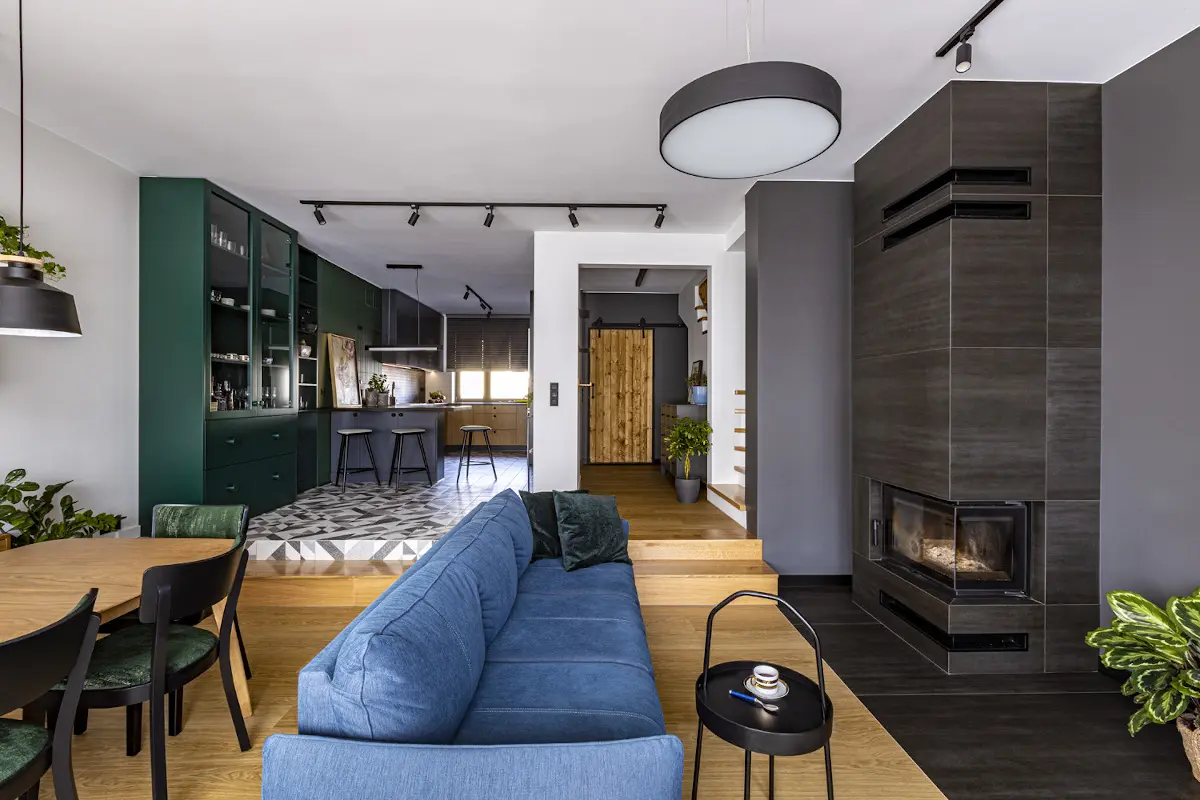 Salon to miejsce spotkań przy wspólnym stole i swobodnego wypoczynku. Kolor zielony, zarówno w meblach, jak i w naturalnej roślinności występującej w dużej dawce, ociepliło aranżację i pozwoliło wprowadzić harmonię do wnętrza. Wypoczynek jest potraktowany jako największa potrzeba mieszkańców. Dzięki zastosowanym rozwiązaniom udało się wykreować przestrzeń stworzoną na miarę tych potrzeb.