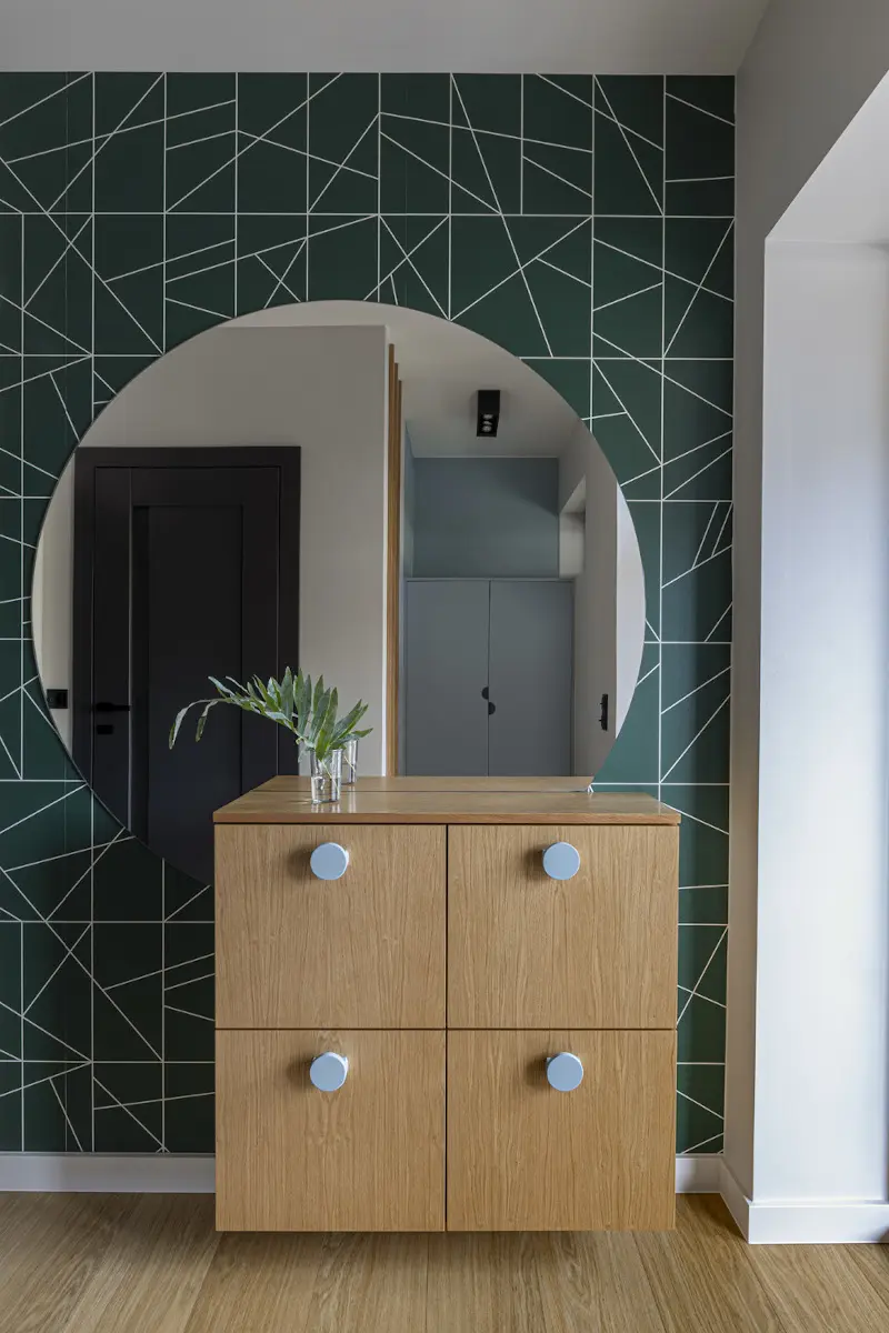 Koncepcja estetyczna projektu jest oparta na zestawieniu ciepłego forniru dębowego, głębokiej zieleni i antracytu. W realizacji znajdziemy zarówno wykonane na zamówienie meble wolnostojące i stolarskie zabudowy, jak i gotowe elementy wyposażenia.