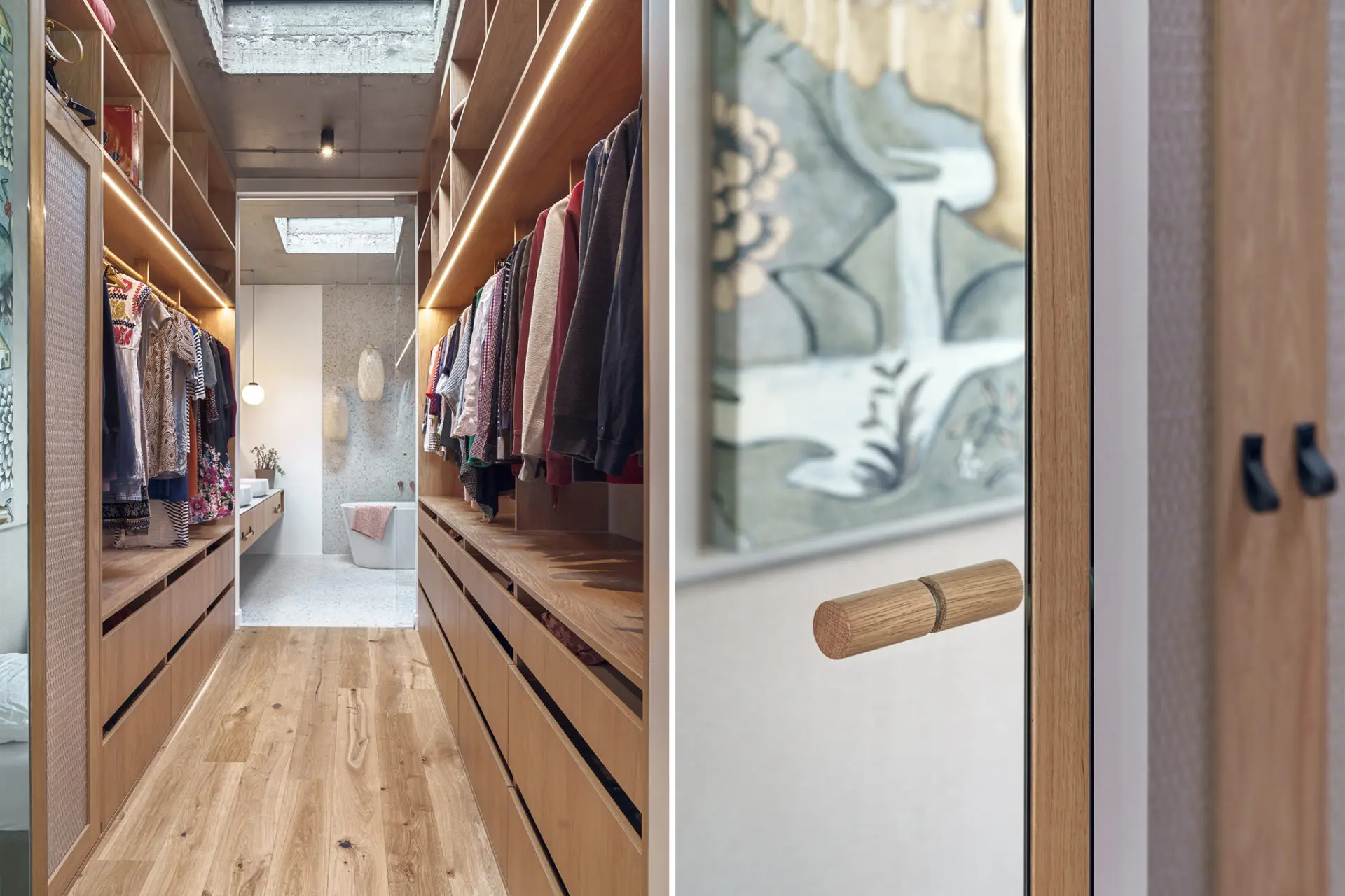 Ciekawym rozwiązaniem jest bezpośrednie przejście z łazienki do garderoby. Oczywiście całe wnętrze utrzymane jest spójnie z całym domem, czyli mamy naturalne drewno i beton.