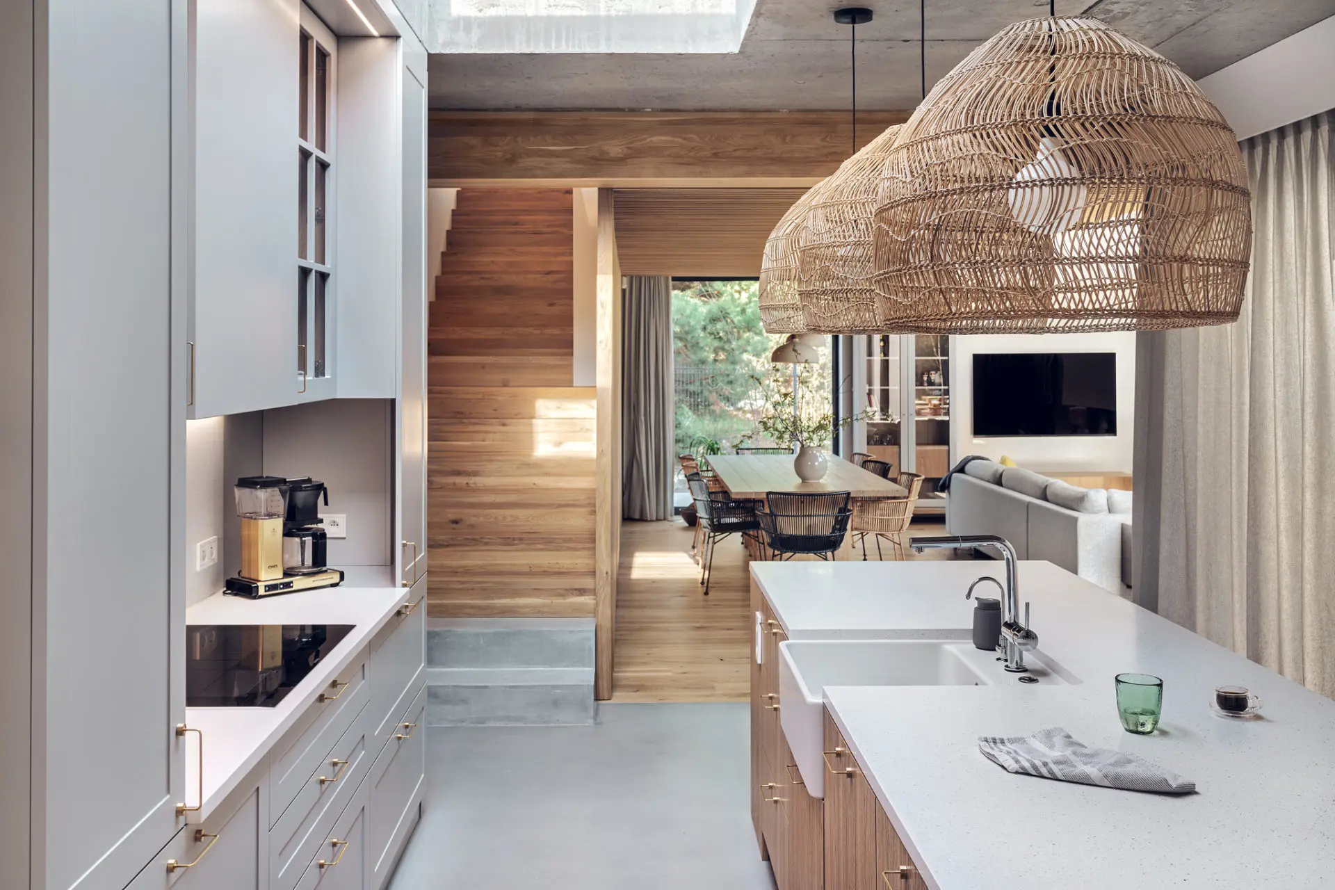 Wnętrze domu prezentuje sprytne połączenie formy i funkcji. Serce domu znajduje się na parterze, gdzie kuchnia wraz z jadalnią otwarta jest na strefę wejściową oraz salon, a ciepła kolorystyka sprawia, że wnętrze jest przytulne i domowe.
