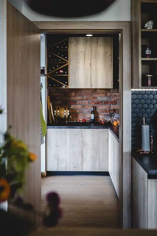 Tuż przy kuchni znajduje się pomieszczenie gospodarcze, które służy głównie do przechowywania, między innymi zbioru win. Tym samym w kuchni łatwiej o porządek. Dzięki dodatkowemu blatowi możemy tu przygotowywać posiłki, nie martwiąc się o bałagan w jednym z najbardziej reprezentacyjnych miejsc w domu.