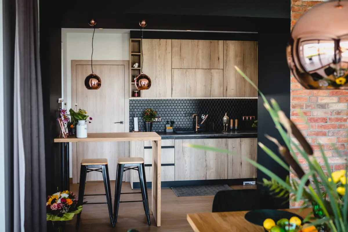 Drewniana kuchnia z kroplą czerni i miedzi