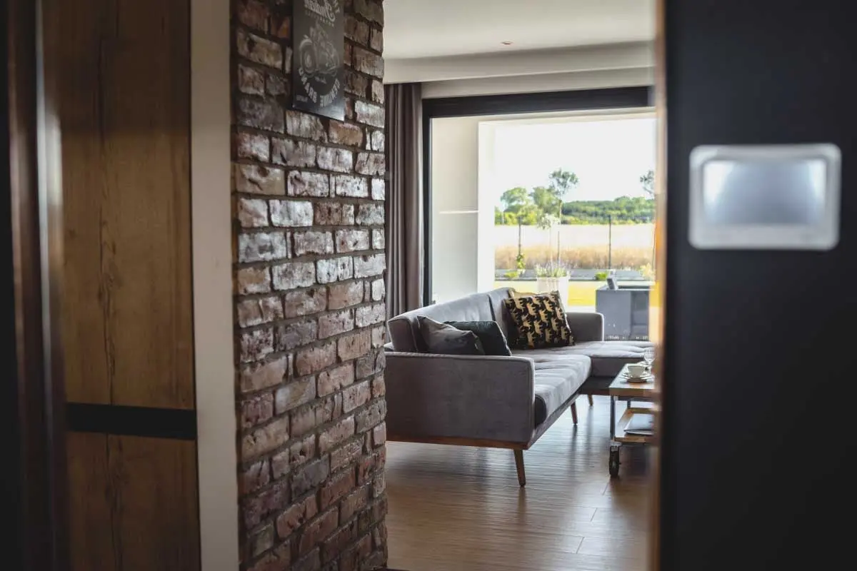 Swój powab i styl zastosowane meble w salonie prezentują na drewnianych nóżkach, nadając wnętrzu jeszcze większej lekkości. Światło zalewające wnętrze przez duże okna jeszcze bardziej „odciąża” projekt, w którym czerń i czerwona cegła odgrywają niemałą rolę.