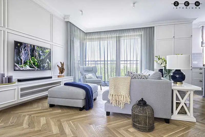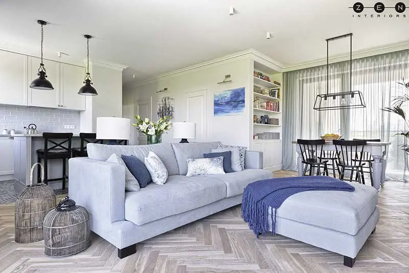 Możemy odnaleźć tu głównie elementy stylu marynistycznego, francuskiego oraz industrialnego. Takie połączenie sprawia, że mieszkanie jest zarazem eleganckie i przytulne. Za elegancję odpowiadają tu detale znane z paryskich kamienic, takie jak jodełka na podłodze czy sztukaterie na ścianach. Składniki niejako już związane ze stylem hampton są dociążone smaczkami w loftowym klimacie. Jak zwykle godnie go reprezentuje chociażby czerń i rzecz jasna – oświetlenie.