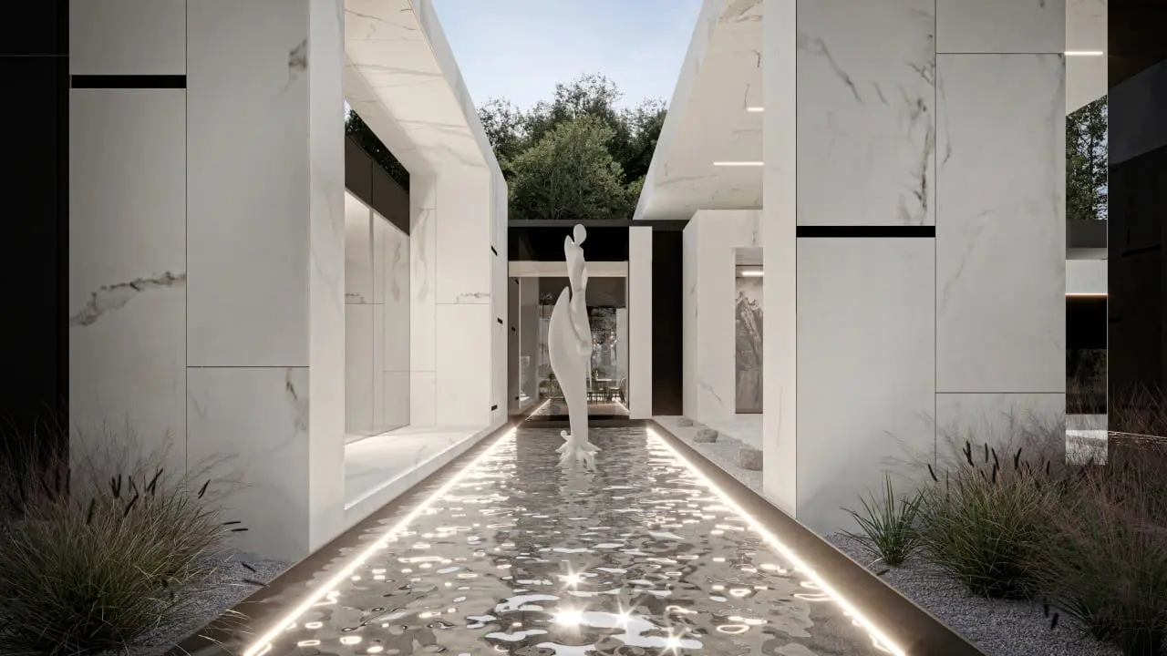 „Chciałem, żeby było coś monumentalnego na wejściu – wielka rama budynku z rzeźbą na środku. To jeszcze bardziej podkreśliło wyjątkowość strefy wejścia. Niestety, ale rośliny mogłyby sobie z tym nie poradzić tak jak biała rzeźba” – dodaje architekt.