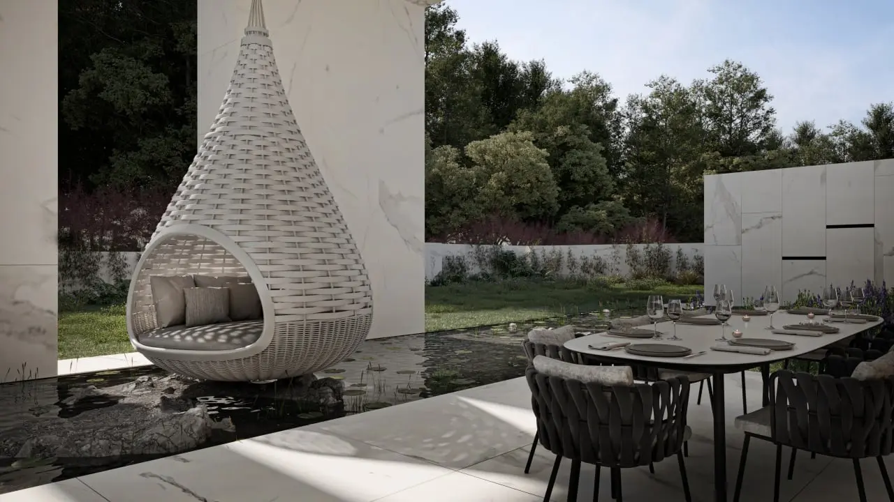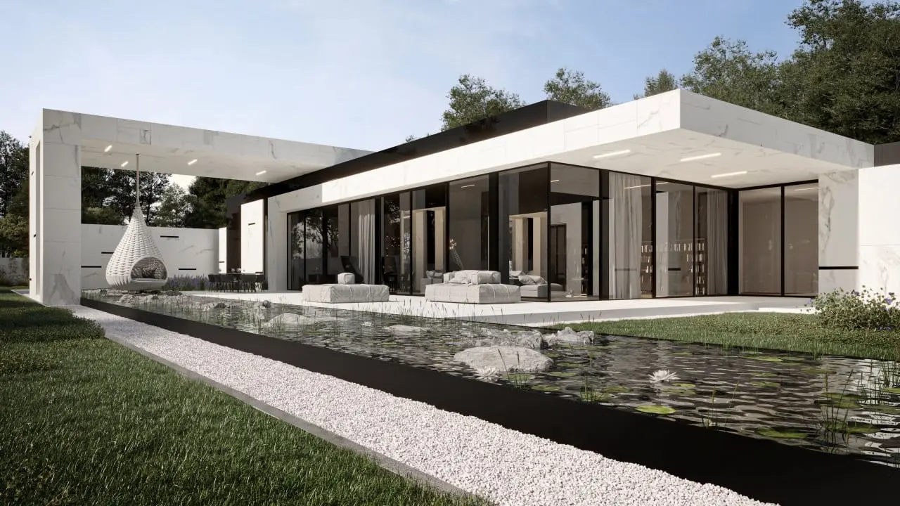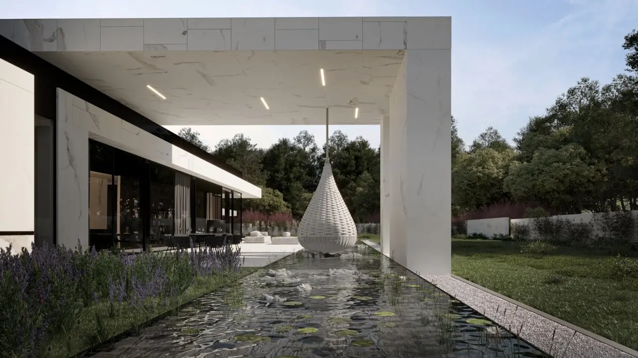 Projekt Marcina Tomaszewskiego to dosyć nieoczywista i nowoczesna bryła. Wchodząc na teren nieruchomości, pierwsze kroki kierujemy w stronę strefy wejścia i zadaszenia, które się nad nim znajduje. Te dwa elementy tworzą główną bryłę. Ona z kolei łączy się z zadaszeniem od strony tarasu. Kluczem całego projektu jest rama, pod którą są schowane inne budynki. Jest ona jak most łączący wszystkie części ze sobą.