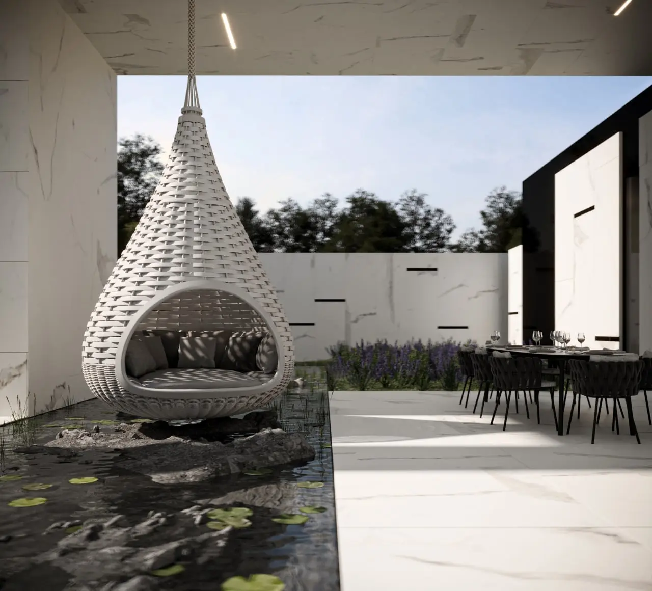 Jest on równie duży. Mamy tu część służącą wypoczynkowi, czyli meble miękkie i część jadalnianą. A wzdłuż całej tej przestrzeni Tomaszewski zaprojektował sadzawkę, którą zresztą można dojrzeć również przy wejściu.