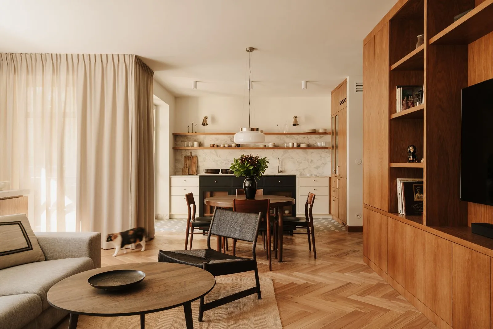 Kuchnia, oddzielona od salonu wyspą z przeszkleniem wykończonym łukowatymi szprosami, stała się ulubionym miejscem domowników. Fronty szaf w półwyspie w kolorze ochry kontrastują z kremową zabudową kuchenną, wprowadzając ducha starej kamienicy. Kącik jadalniany z okrągłym stołem polskiej marki Fameg i klasycznymi krzesłami z giętej sklejki oplecionymi plecionką wiedeńską, to idealne miejsce na rodzinne spotkania.
