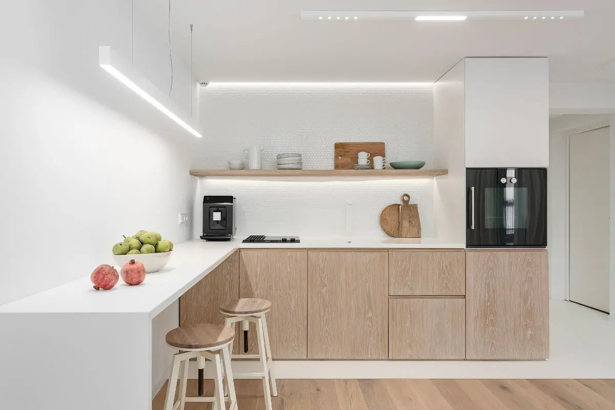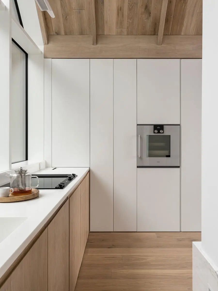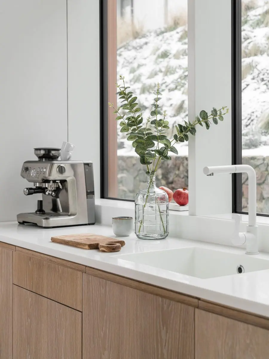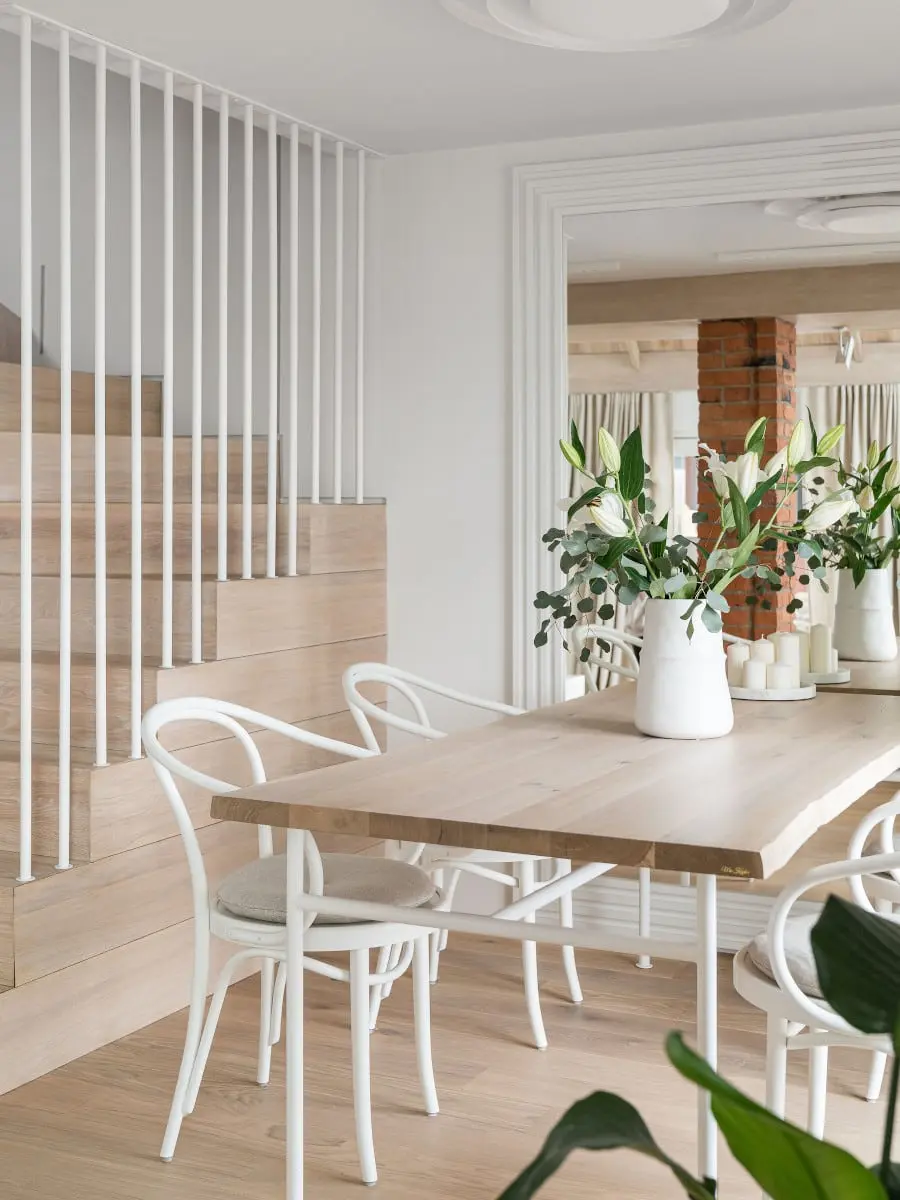 Przewaga naturalnych barw i faktur sprawia, że wnętrza są otulone przytulnością. Wrażenie domowego ciepła potęgują żywe rośliny a także zbiór obrazów, które ozdabiają minimalistyczne białe ściany.