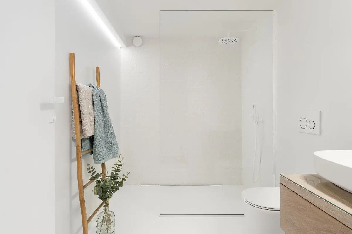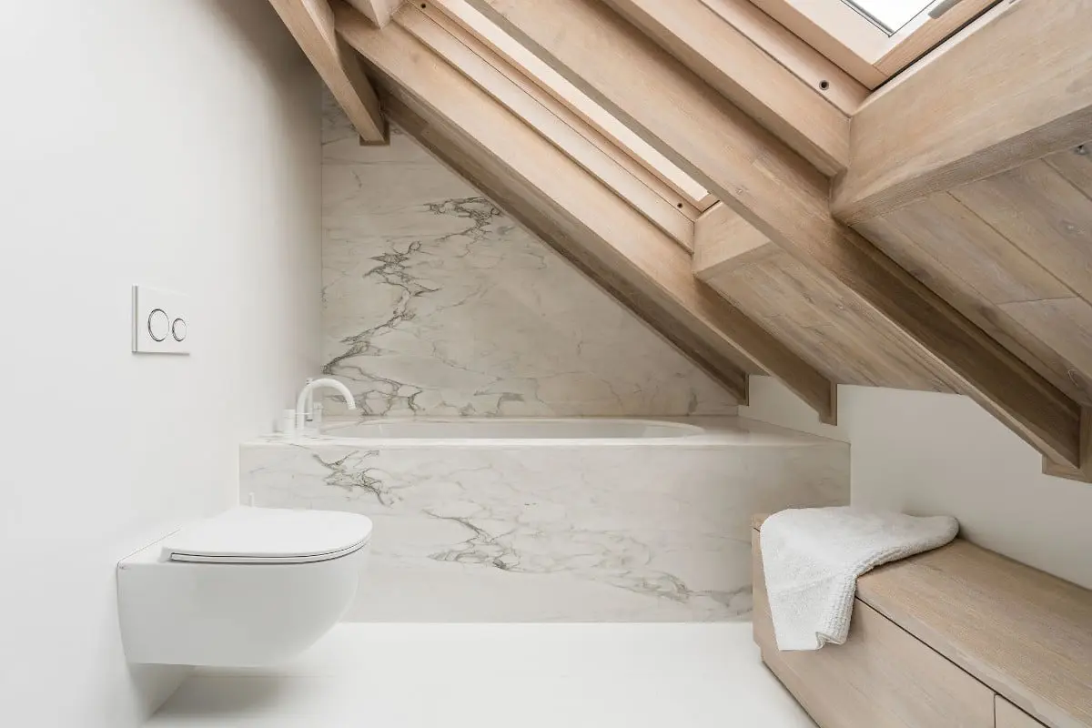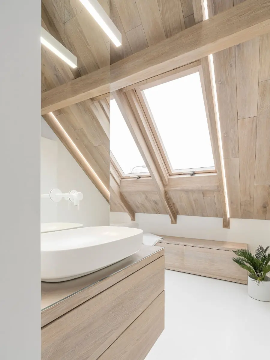 W łazience ogólnie dostępnej architektka zastosowała odpływ liniowy oddzielony od reszty pomieszczenia szklanym przepierzeniem. W łazience stanowiącej prywatne domowe spa, centrum stanowi wanna wolnostojąca. W najtrudniejszym punkcie łazienki na poddaszu, czyli przy ścianie kolankowej pojawiły się potrzebne półki, które zwiększają funkcjonalność salonu kąpielowego. Pożądany klimat można wykreować za pomocą listew LED wtopionych pomiędzy drewniane deski.