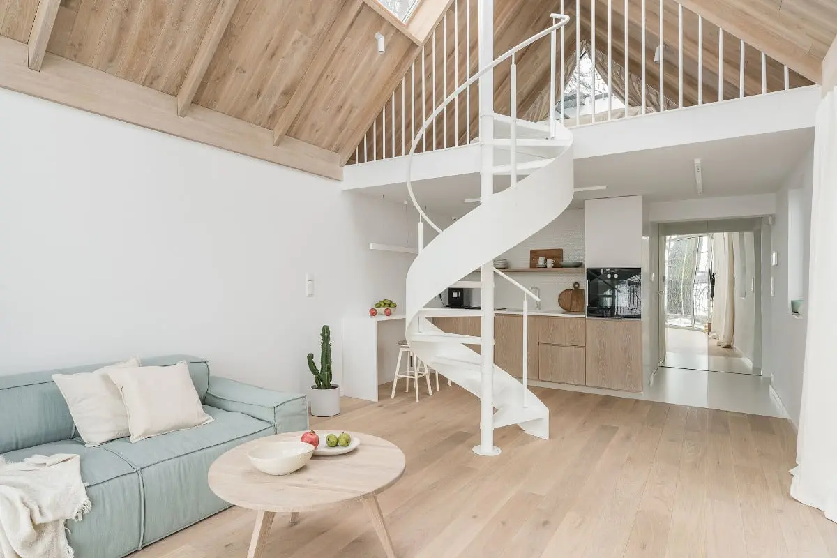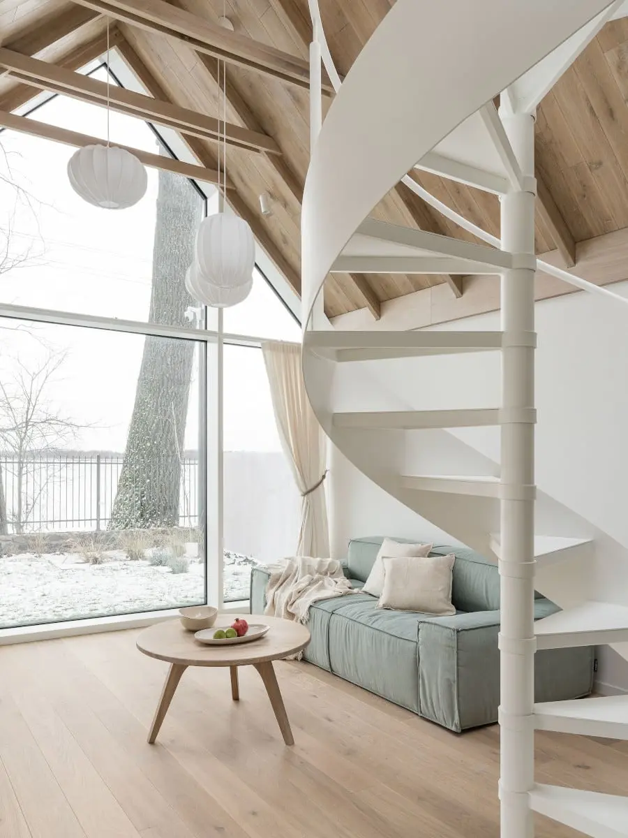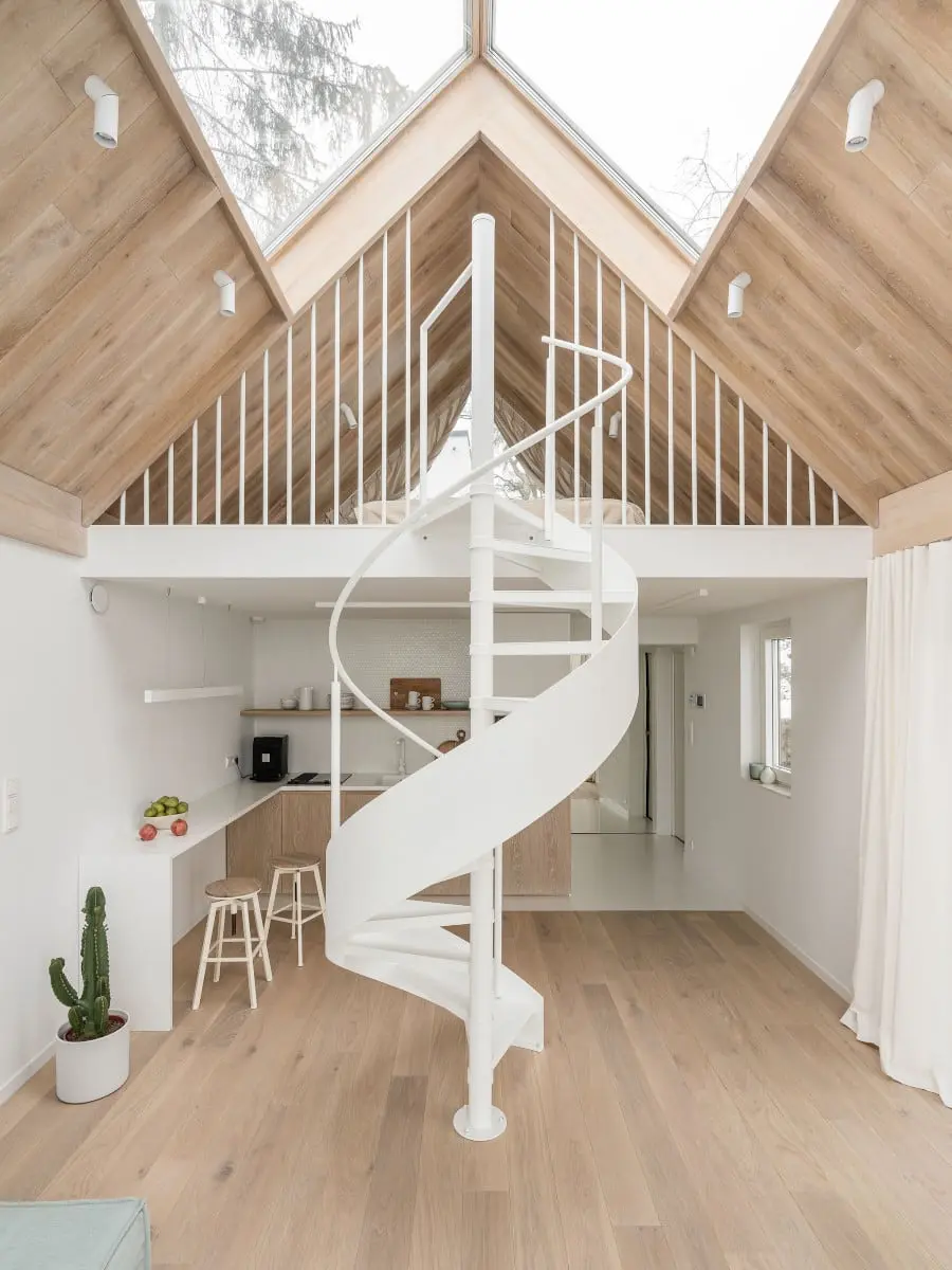 Osobny domek, stanowiący bliźniaczy budynek, jest również w formie nowoczesnej stodoły. To lokum o metrażu 30 m2 zaprojektowano z myślą o przyjmowaniu gości. W jego skład wchodzi salon, kuchnia, łazienka oraz sypialnia na antresoli. Mocnym punktem aranżacji są zakręcone schody. Obecny tu świetlik nie tylko rozjaśnia wnętrze, ale też sprawia wrażenie schodów do nieba. Spójność inwestycji gwarantuje konsekwentne operowanie tymi samymi kolorami i fakturami w obrębie obu projektów.