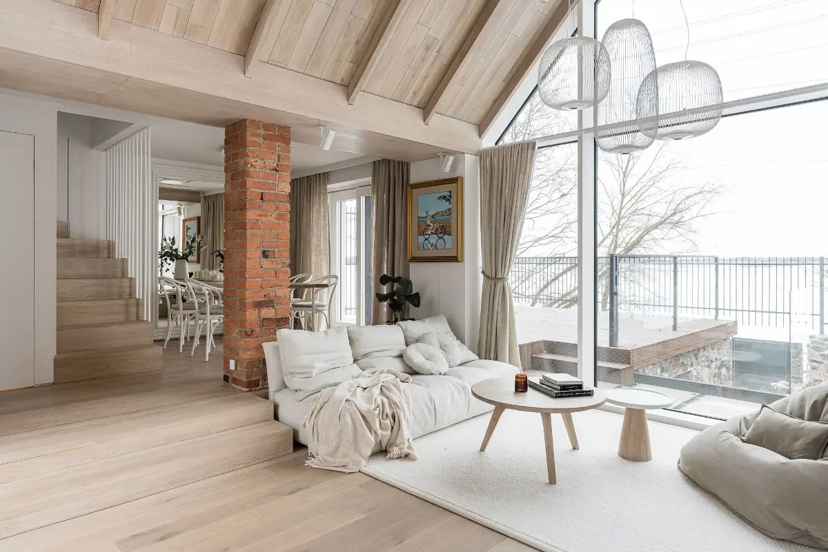 Nie bez powodu arch. Katarzyna Piotrowska obrała właśnie taki kierunek. Nowa aranżacja nie mogła przytłoczyć natury wdzierającej się do wnętrza z każdej strony domu. Otacza go woda, stary ogród i sad porastający skarpę. Dzięki zastosowanym środkom wystrój apartamentu idealnie współgra z dziką przyrodą otulającą budynek. Duże przeszklenia tworzą wrażenie jedności człowieka z naturą.